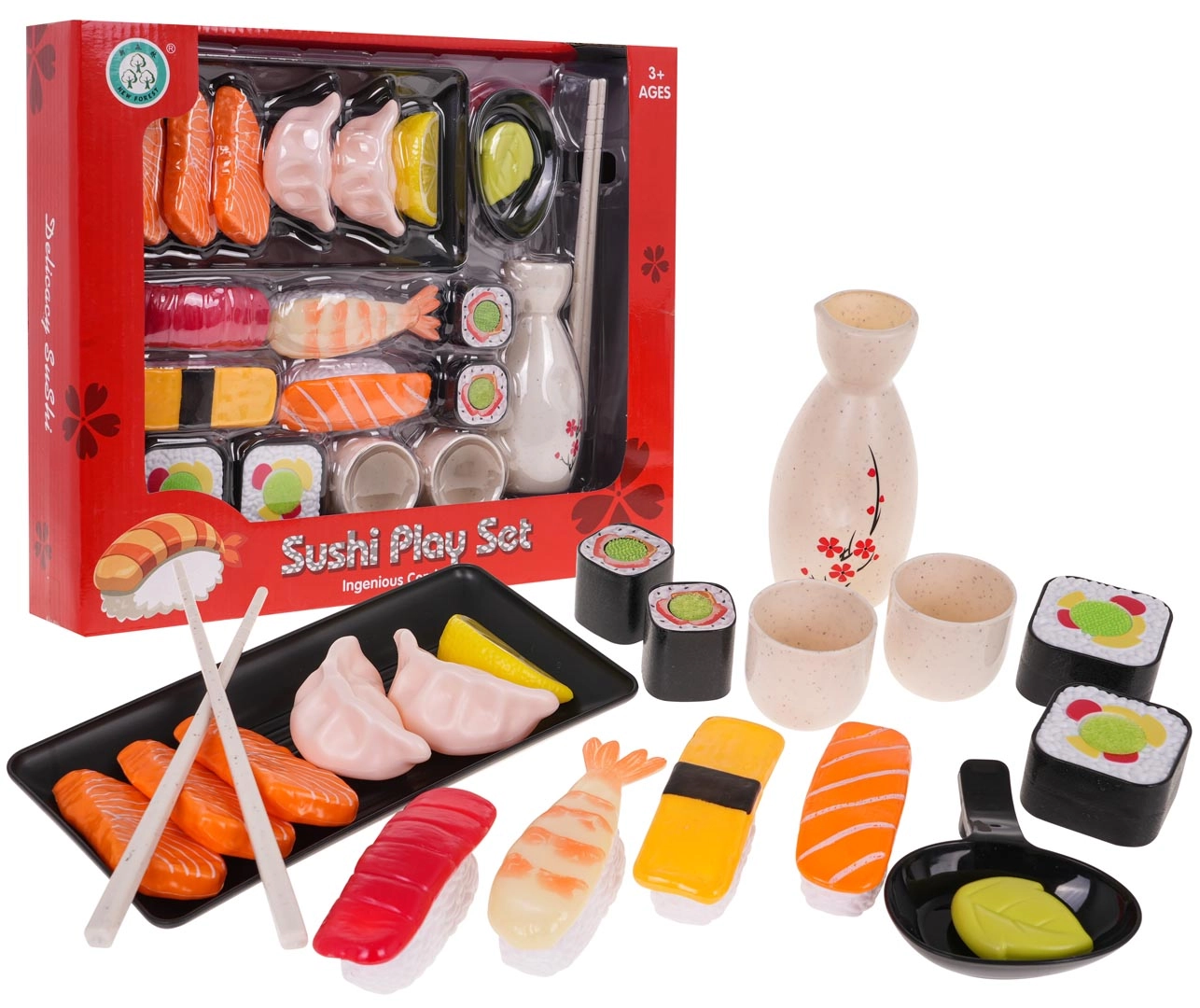 Komplektist leiate kõik vajaliku serveerimiseks – alates alustest ja kausikestest kuni pulkade ning erinevate sushi- ja sashimitüüpide ning lisanditeni. Takaribadega detailid võimaldavad realistlikke „ühenda ja serveeri” stsenaariume, mida lapsed armastavad.