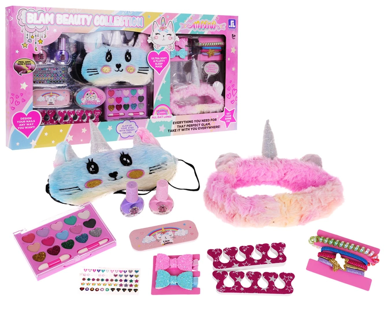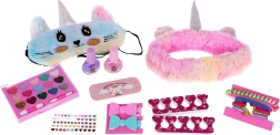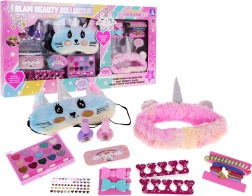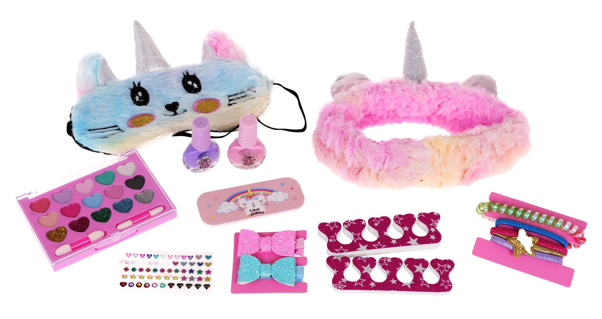 Komplekti kuuluvad 15 lauvärvi palett, laste küünelakid, pintslikesed, juuksekummid, klambrid ja spiraalkumm ning samuti unicorni peapael ja silmamask. Lõbus kosmeetikakomplekt ergutab loovust, arendab peenmotoorikat ja kujundab maitset ning värvitaju.