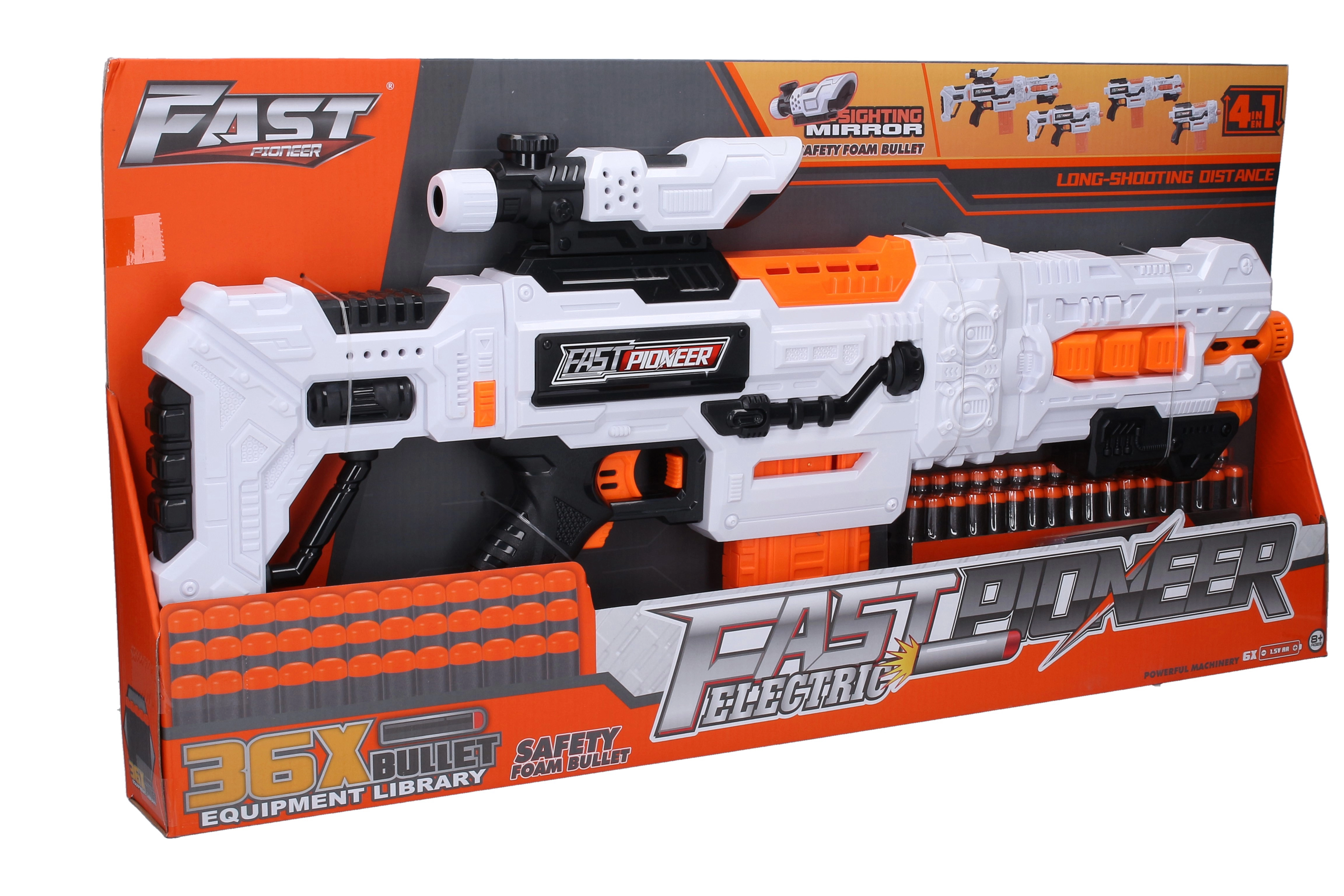 Lõbus ja tegus mäng lastele ning teismelistele: elektriline vahtkuulipilduja 4‑in‑1 võimsa jõudluse, 36 vahtkuuli ja 4 erineva konfiguratsiooni võimalusega. Lihtne käsitseda, ohutuslukk ja kiire salvevahetus lõputuks lõbuks nii toas kui õues.