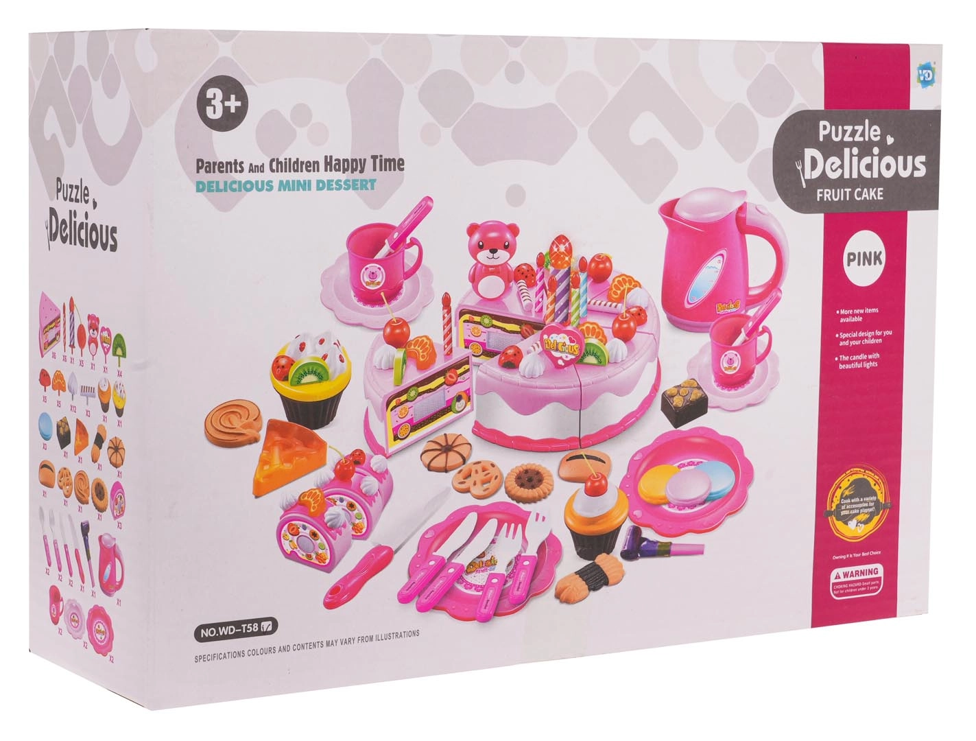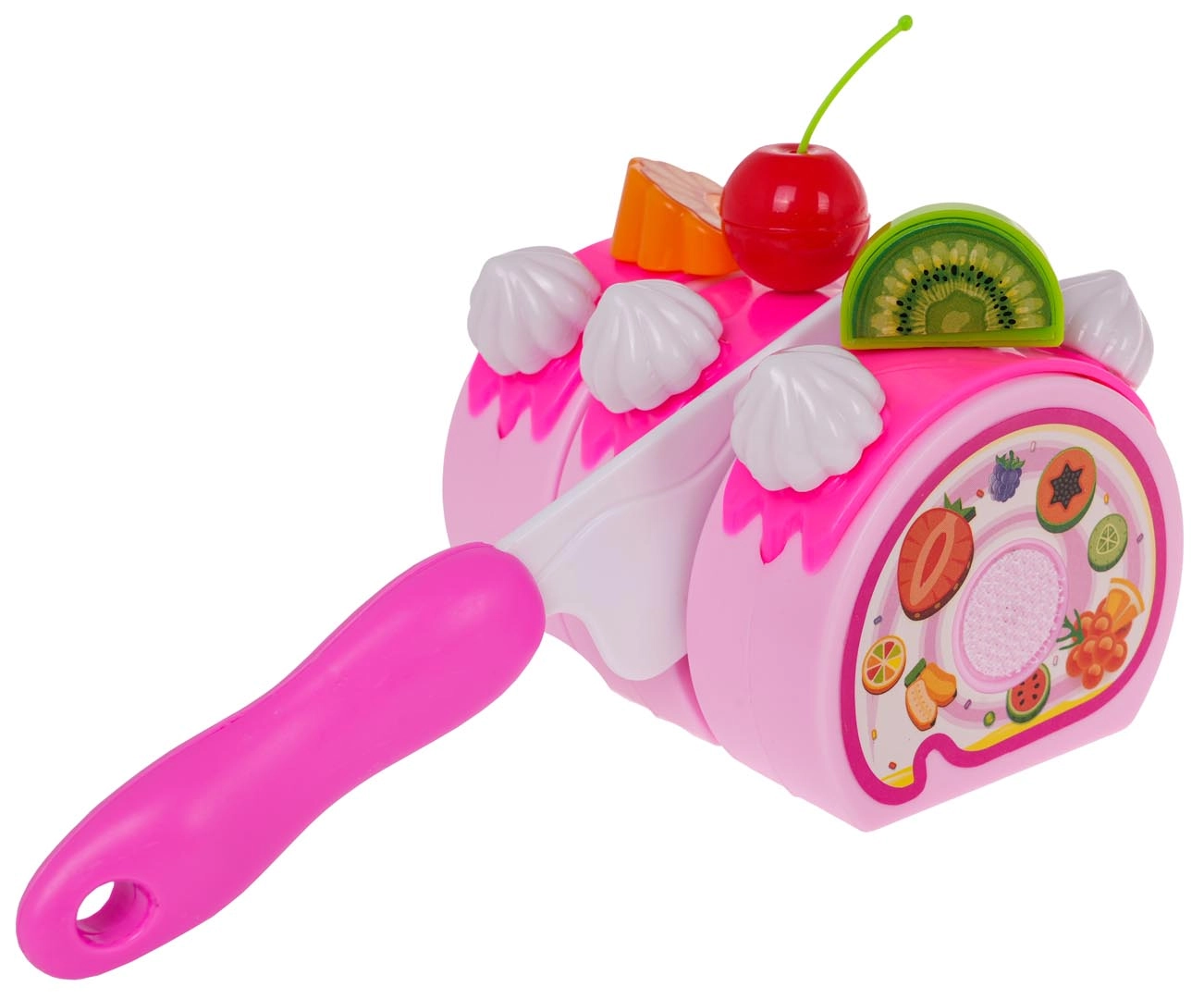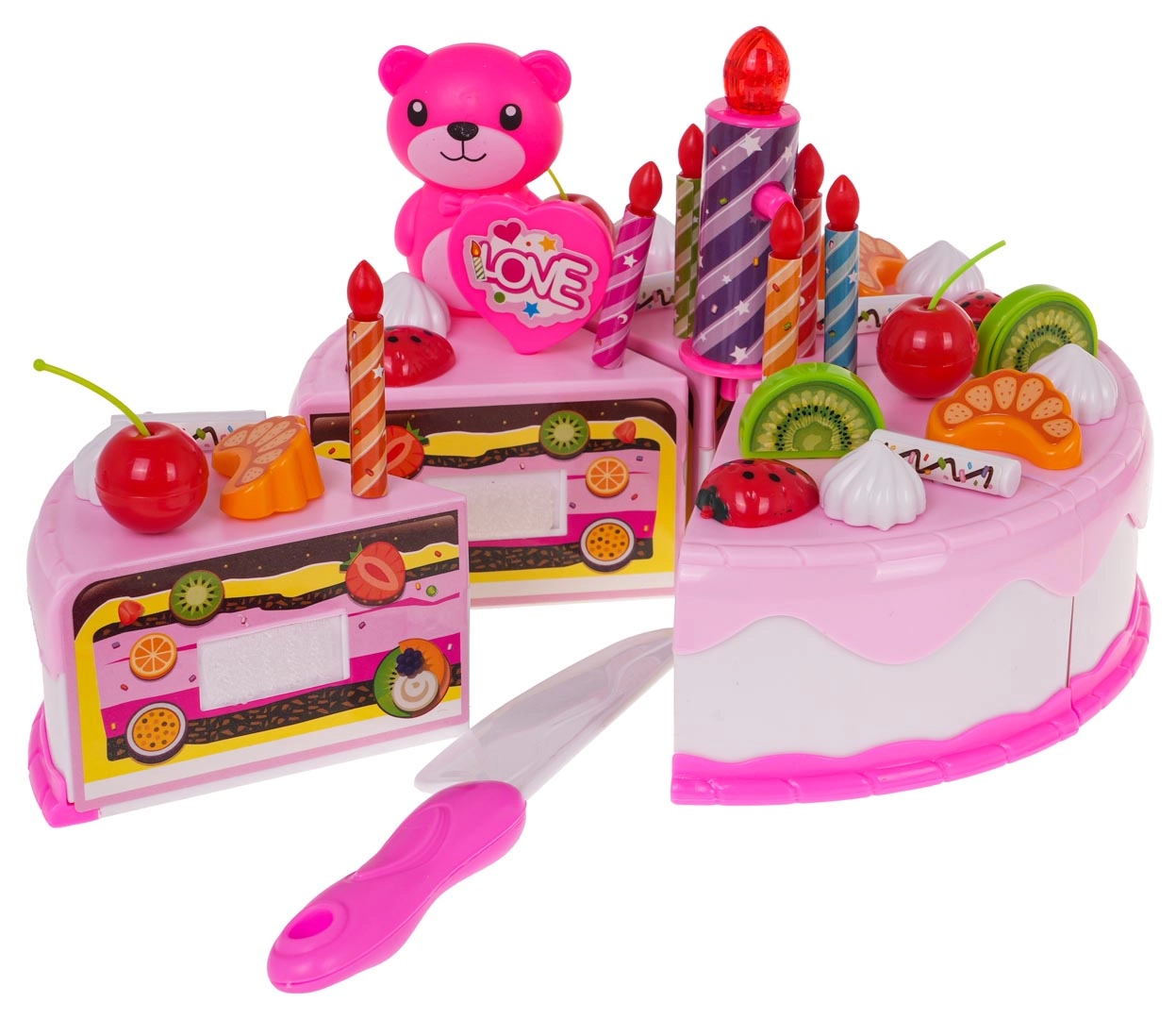 See rikkalik roosa sünnipäevakomplekt muudab toa väikeseks koogipoeks. Kuueosalist takjaga kooki saab kaasasoleva noaga „lõigata”, kaunistada puuviljade, küpsiste ja armsate lisanditega. Suur küünal süttib nupuvajutusel kahe värviga (RL41 patareid on komplektis), lisades peole muinasjutulise meeleolu.