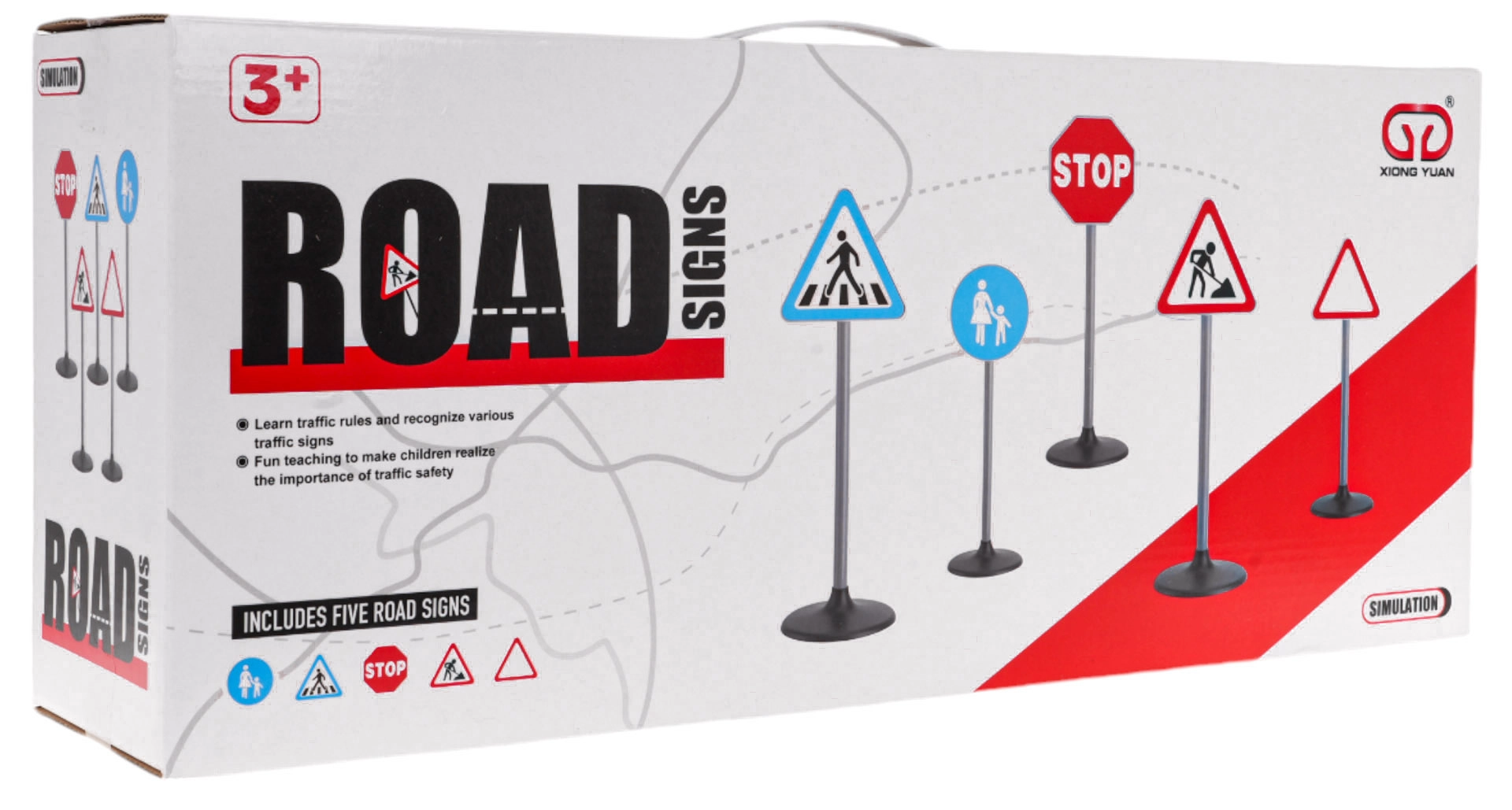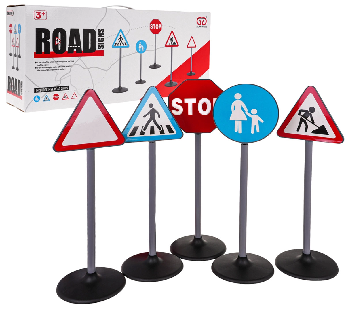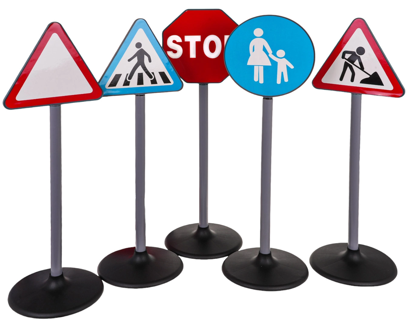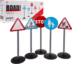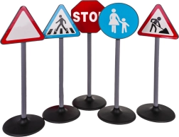 See liiklusmärkide komplekt sisaldab viit erinevat märki: STOP, ülekäigurada, hoiatuskolmnurk, teetööd ja jalakäijate ala. Need on valmistatud kvaliteetsest plastist ning realistlikult viimistletud, pöörates tähelepanu detailidele. Märgid on mõõtmetelt kohandatud lapse pikkusele, mis teeb neist ideaalse hariva mänguasja kõige pisematele.