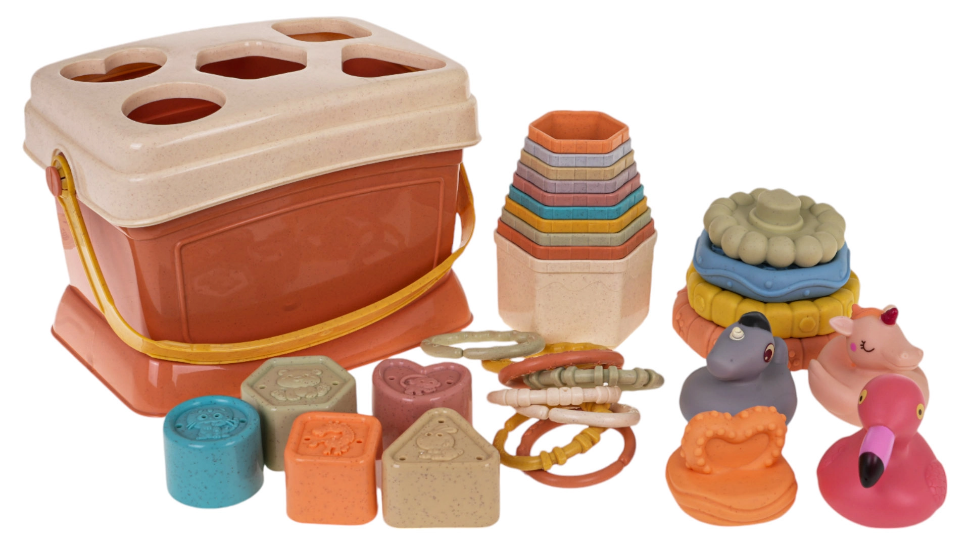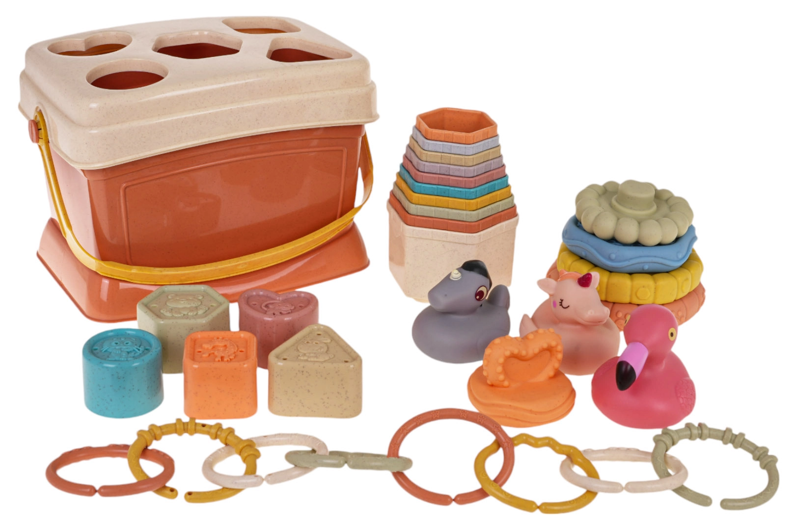 Laste kuju- ja sorteerimiskomplekt on suurepärane õppekomplekt alates 6. elukuust. See arendab lapse kujutlusvõimet ning õpetab tundma värve ja kujusid. Iga elementi on kujundatud nii, et erksad värvid ja huvitavad kujundid köidavad laste tähelepanu ja innustavad mängima.