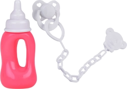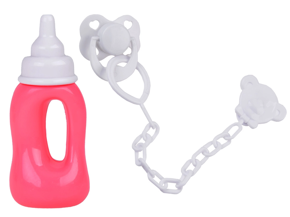 Komplektis on roosa pudel ja valge lutt ketiga ning klambriga – tarvikud, mis toetavad realistlikku hoolitsemist.