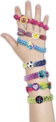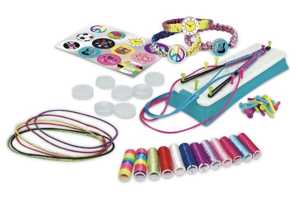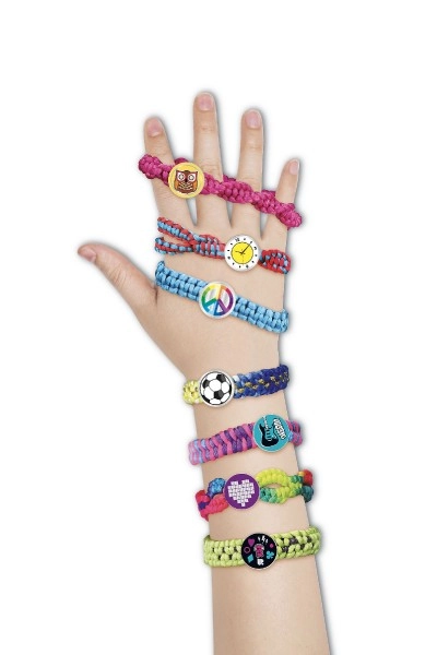 Tänu rikkalikule komplektile lõngade, ühendusnööbikeste ja kleepsudega loote terve kollektsiooni värvilisi käevõrusid.
