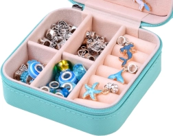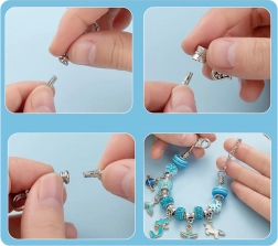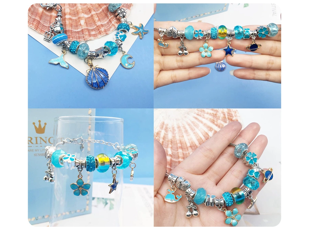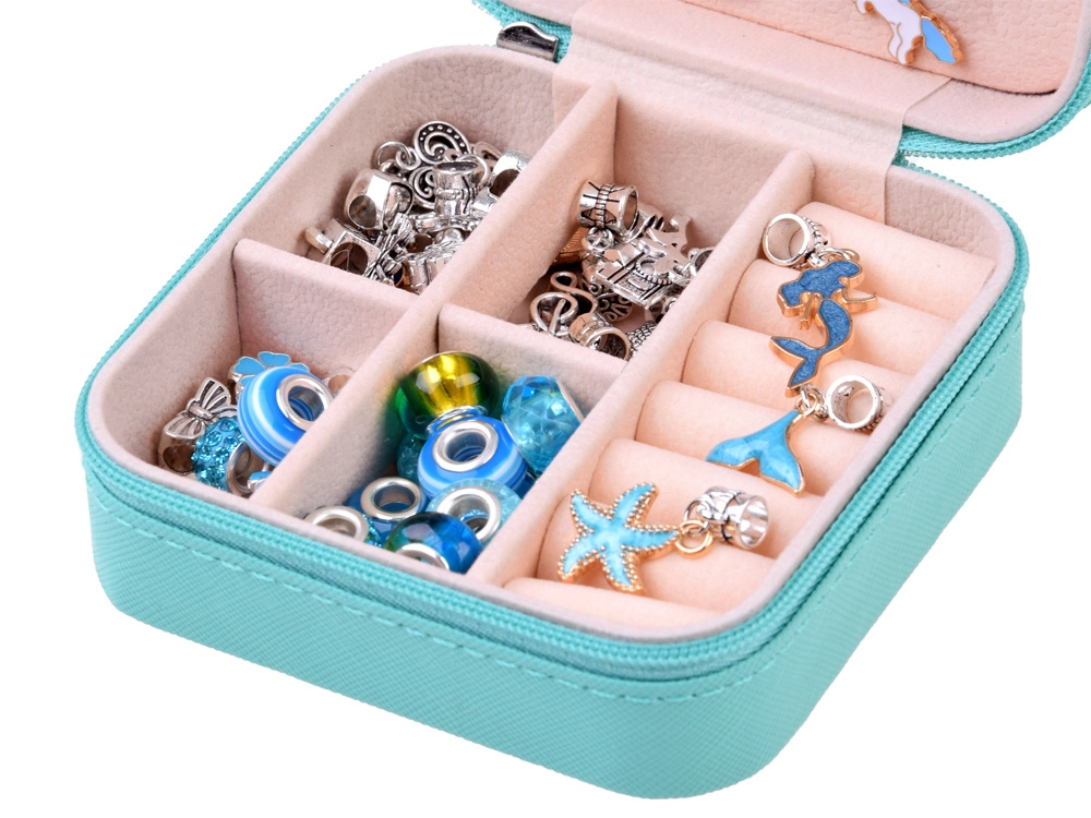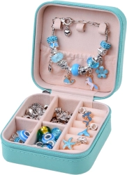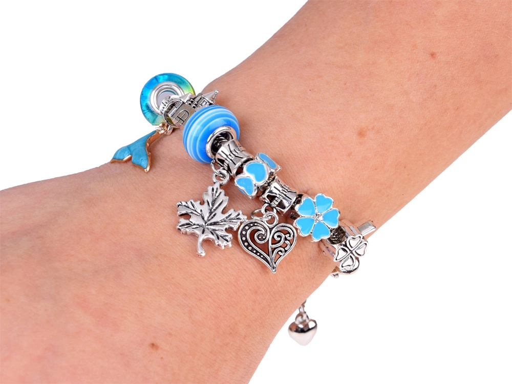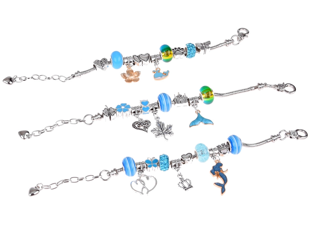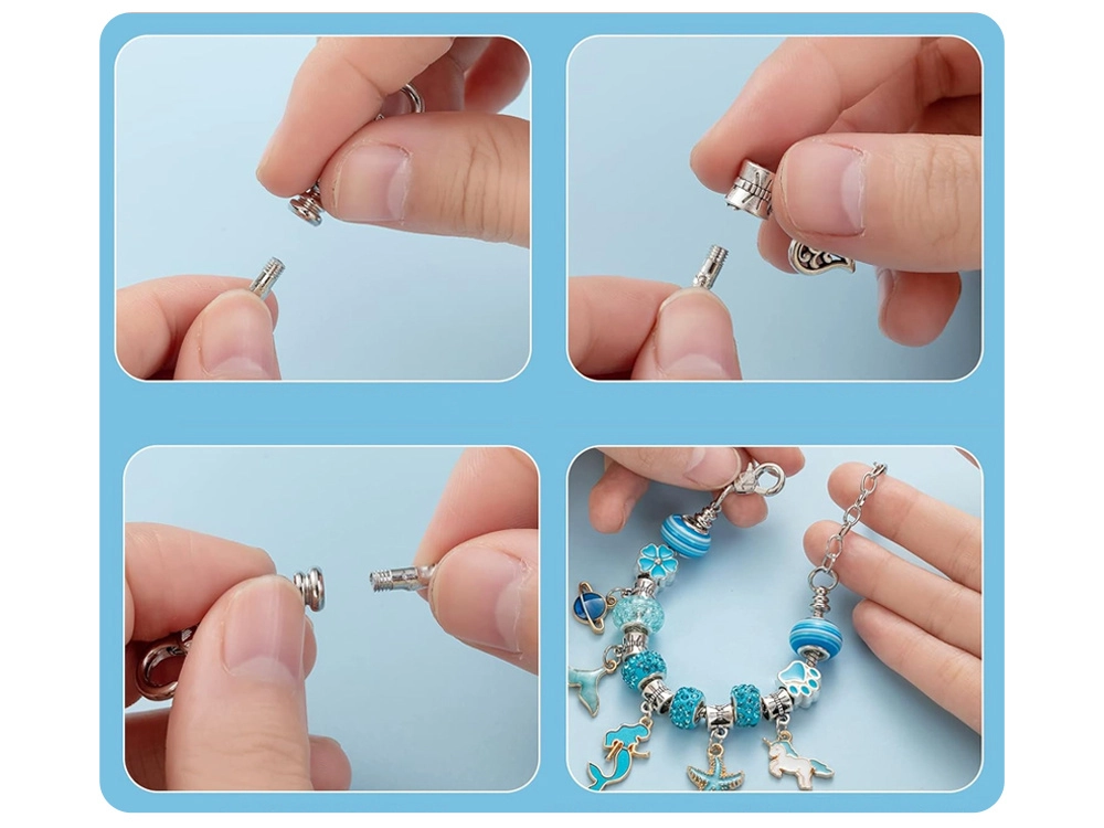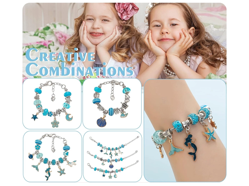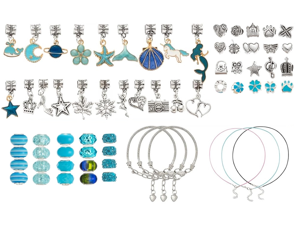 Loo ainulaadne bijou selle täieliku komplektiga elegantses ehtekarbis. Leiad sealt kõik originaalsete käevõrude ja kaelakeede valmistamiseks – metallketid, vahatatud nöörid, dekoratiivsed helmed ja charms-ripatsid. Ideaalne loovatele lastele ja täiskasvanutele, kes armastavad käsitööd ja soovivad omada unikaalseid ehteid sinakas‑hõbedases stiilis.