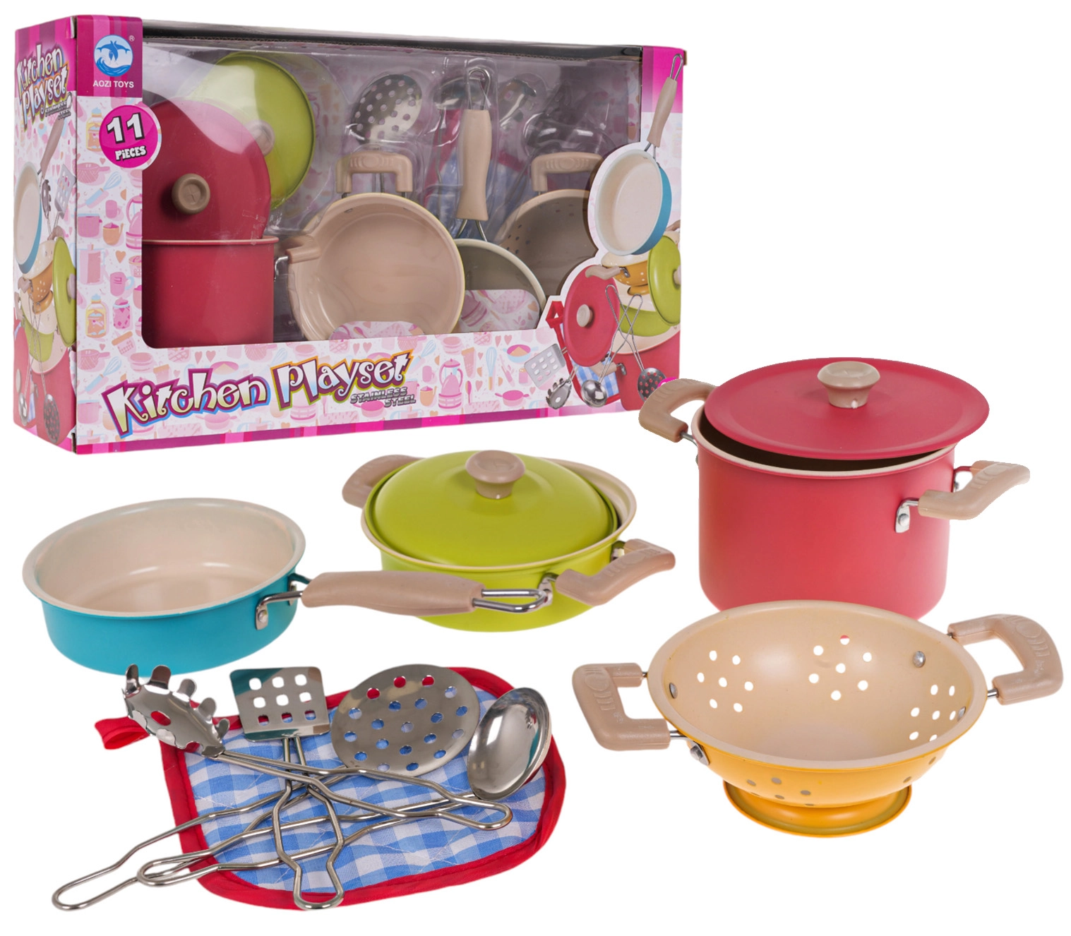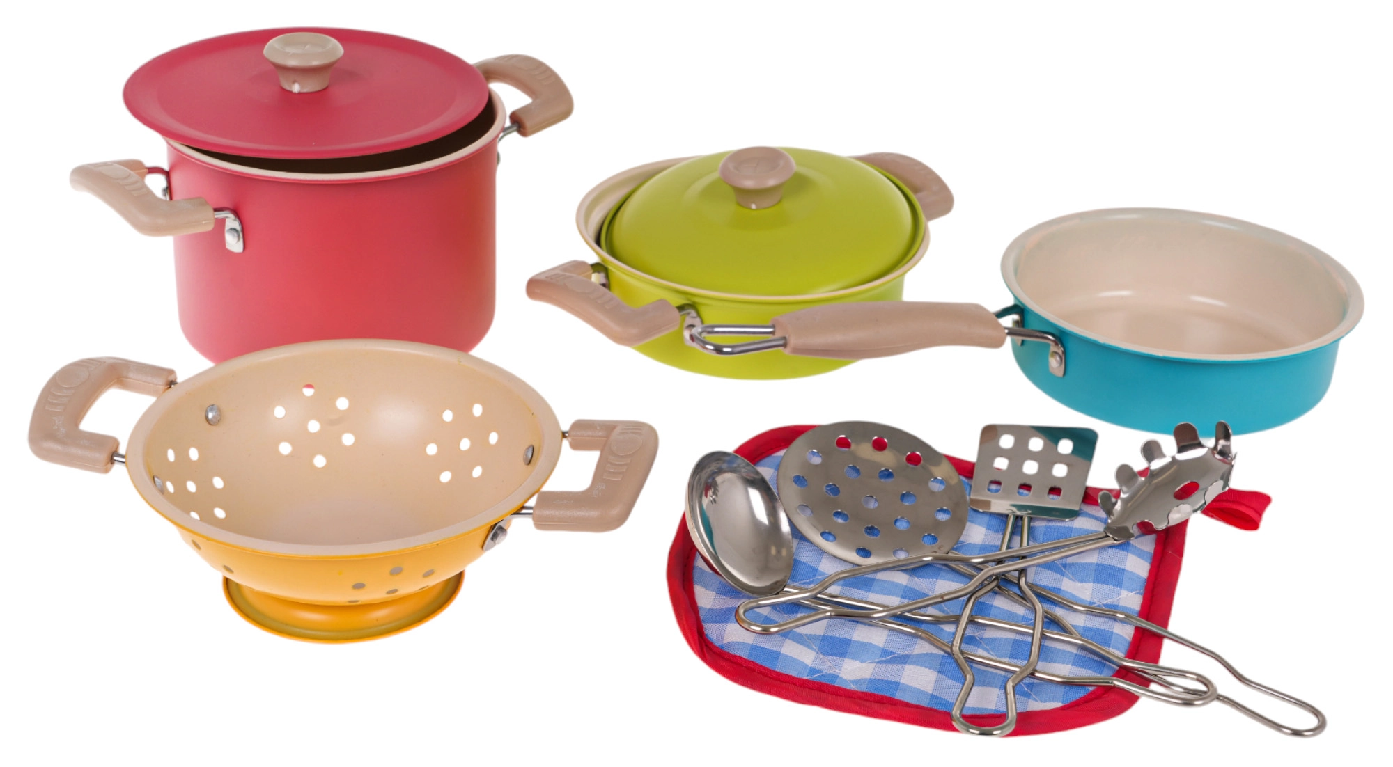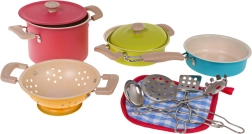 See värviline laste nõudekomplekt toob iga lapse kööki autentse kokkamiskogemuse. Kaks potti kaantega, pann, kurn ning neli praktilist köögiriista pakuvad kõik vajaliku päris kokkamise matkamiseks. Tänu metallist materjalidele on komplekt tugev, vastupidav ja valmis igapäevaseks mänguks.