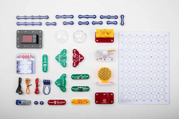 - 1× plaat, 35× detaili (nt lennuk, miniatuurne auto, kõlar, liikumisandur, ülekandega mootor), 1× käsiraamat (allalaaditav veebist)