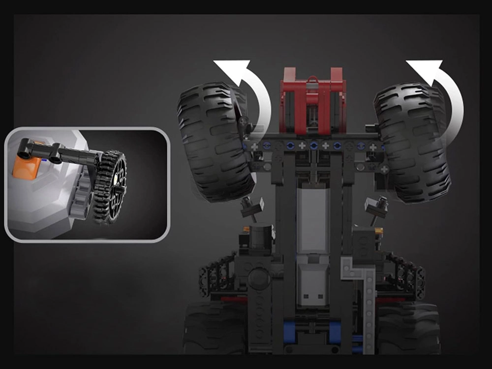 Kaks M-mootorit, üks L-mootor ja täpne servomehhanism tagavad sõidu edasi/tagasi ning täpse juhtimise. Tõsta tagumist haakeseadet ja pööra kinnitust 180° puldist.