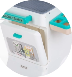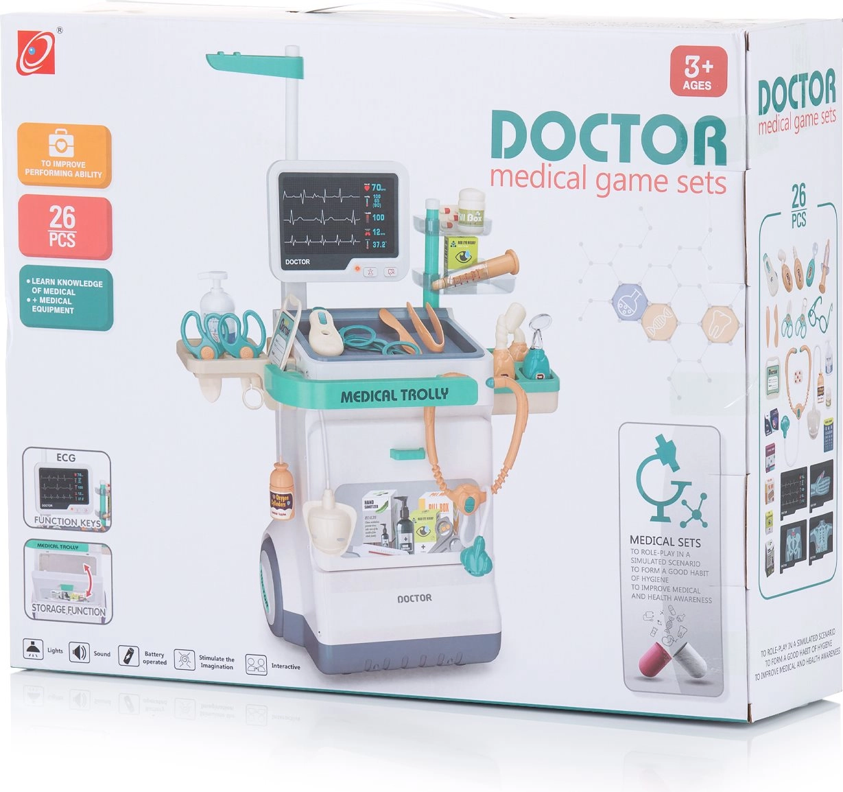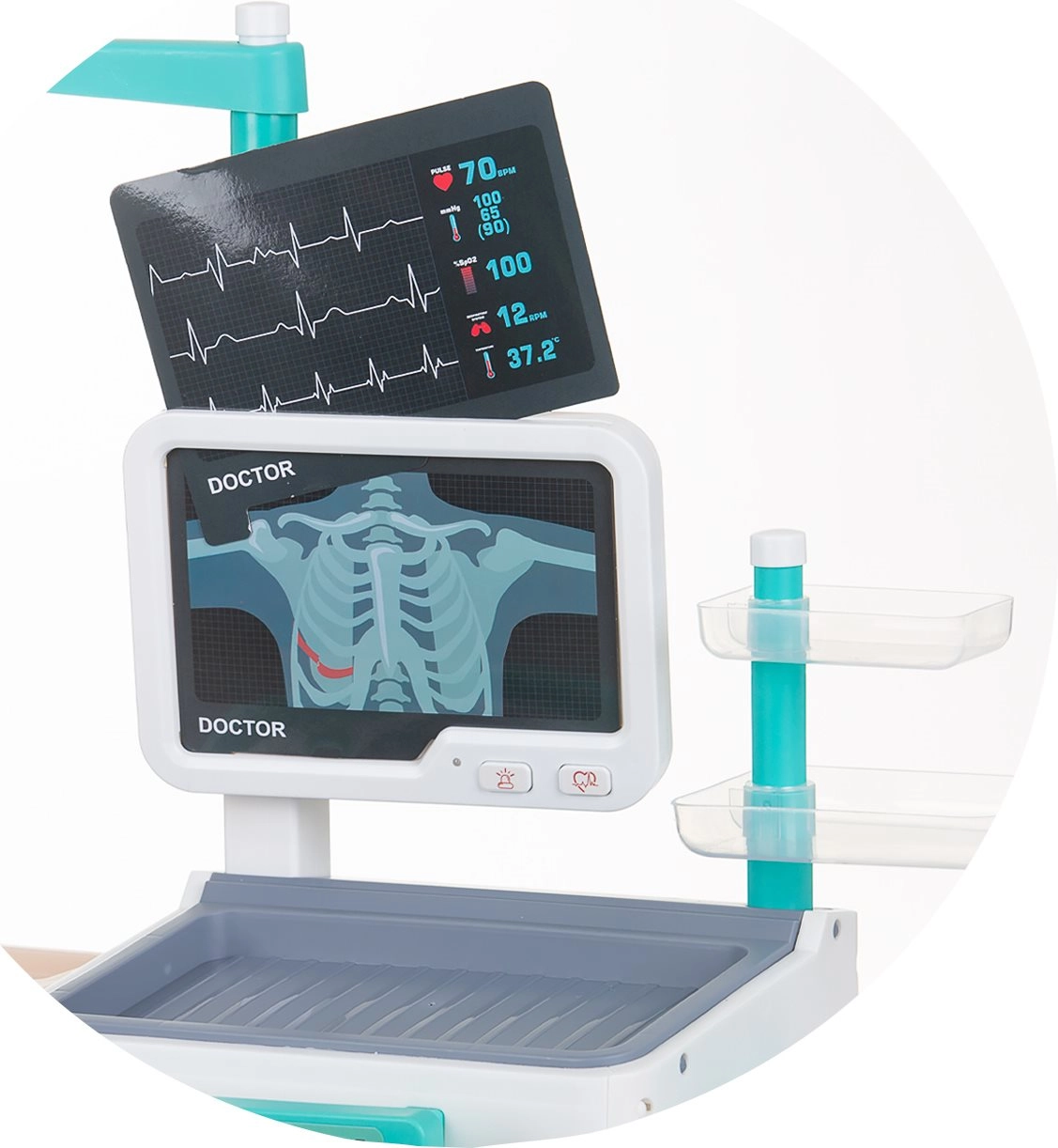 See mängukomplekt sobib suurepäraselt lastele, kes soovivad arstiks saada. Komplektis on 26 tarvikut, sh riiulitega tarvikukäru, valgustusega röntgenpaneel ja muud meditsiinilised lisad. Lapsi ootab interaktiivne mäng valguse ja helidega.