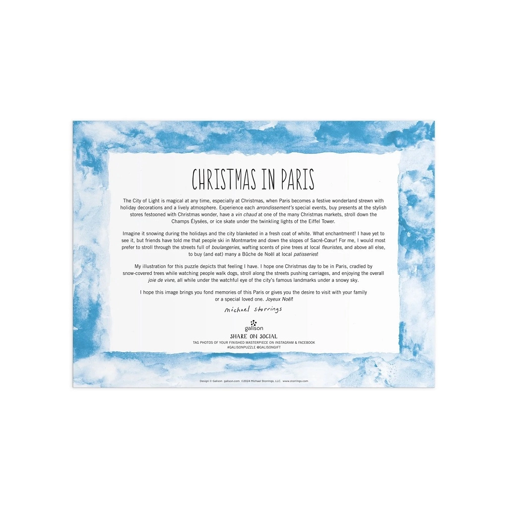 Avastage talvise Pariisi võlu Michael Storringsi detailse illustratsiooni kaudu. Rikkalikult kujundatud stseen, täis tulesid, poode ja jõulumeeleolu, rõõmustab nii kunstisõpru kui ka nõudlikke puslemeistreid. Spetsiaalne fooliumpind särab metallikuna valguse käes ja annab valmispildile ainulaadse ja premium-välimuse.