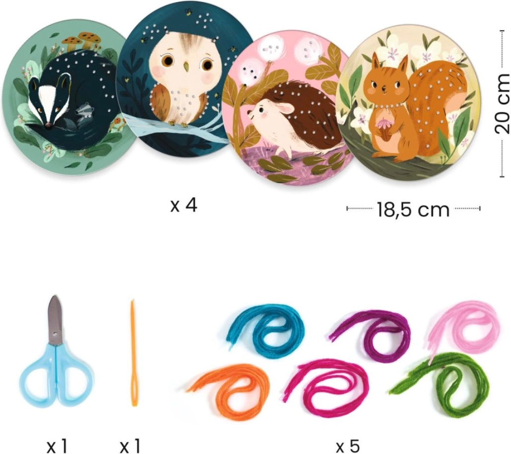 Komplekti sisu on läbimõeldud, et tegevus oleks turvaline, lõbus ja motiveeriv. Värviline lõng, nüri nõel ja laste käärid toetavad iseseisvust ja enesekindlust töö käigus. Valminud tikandid sobivad suurepäraselt lastetoas eksponeerimiseks.
