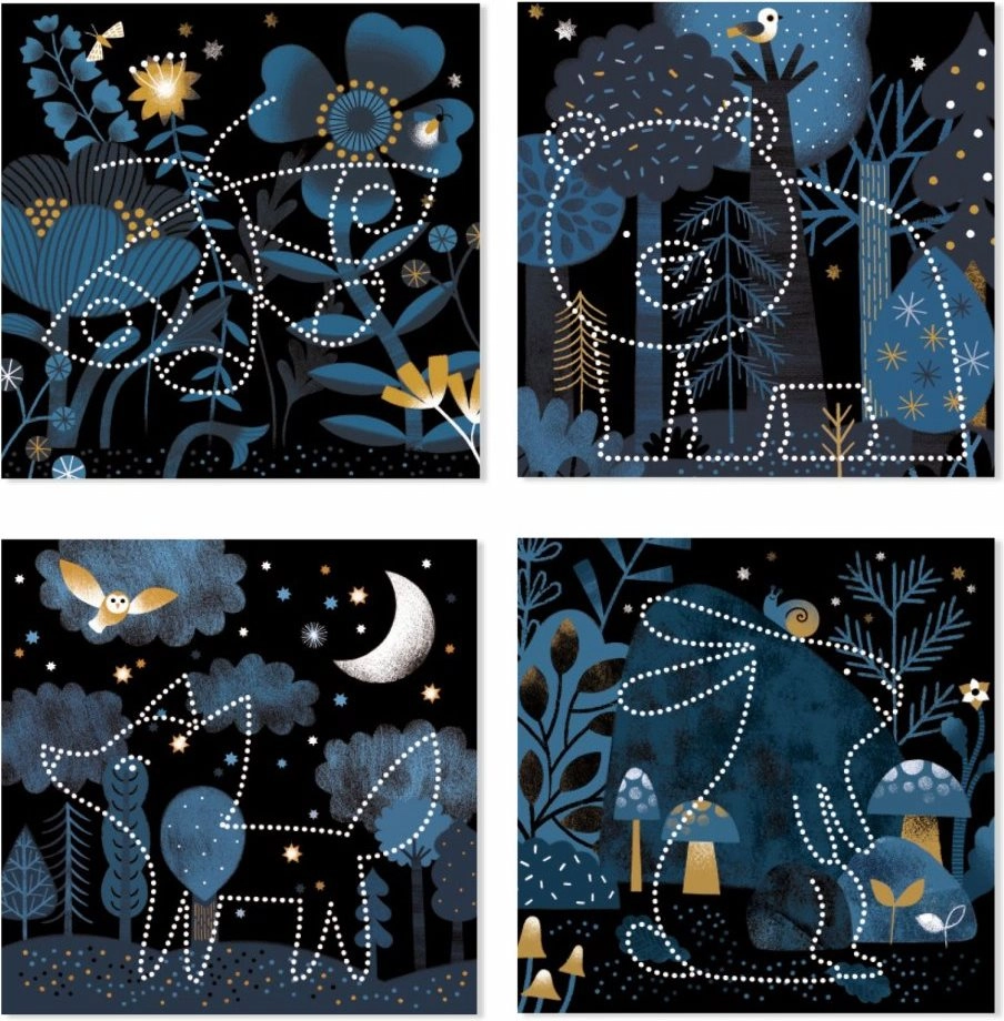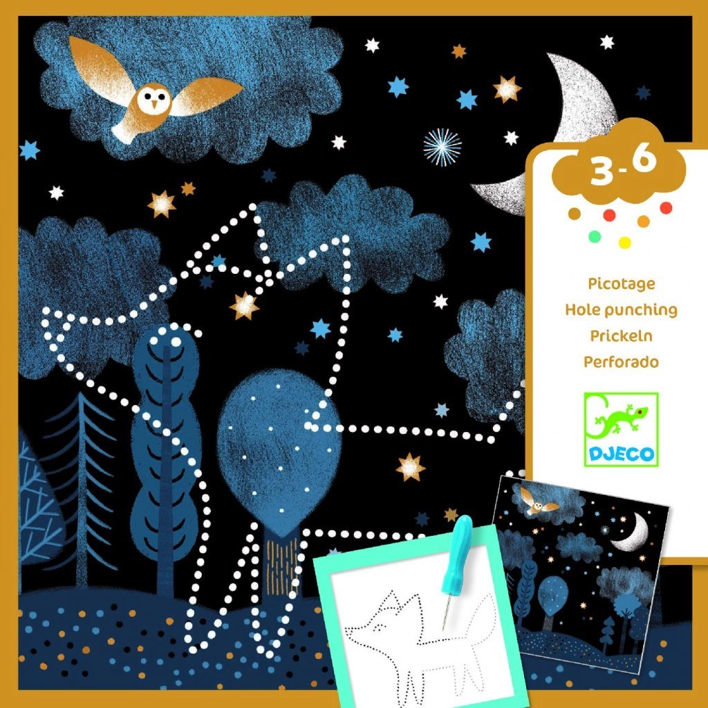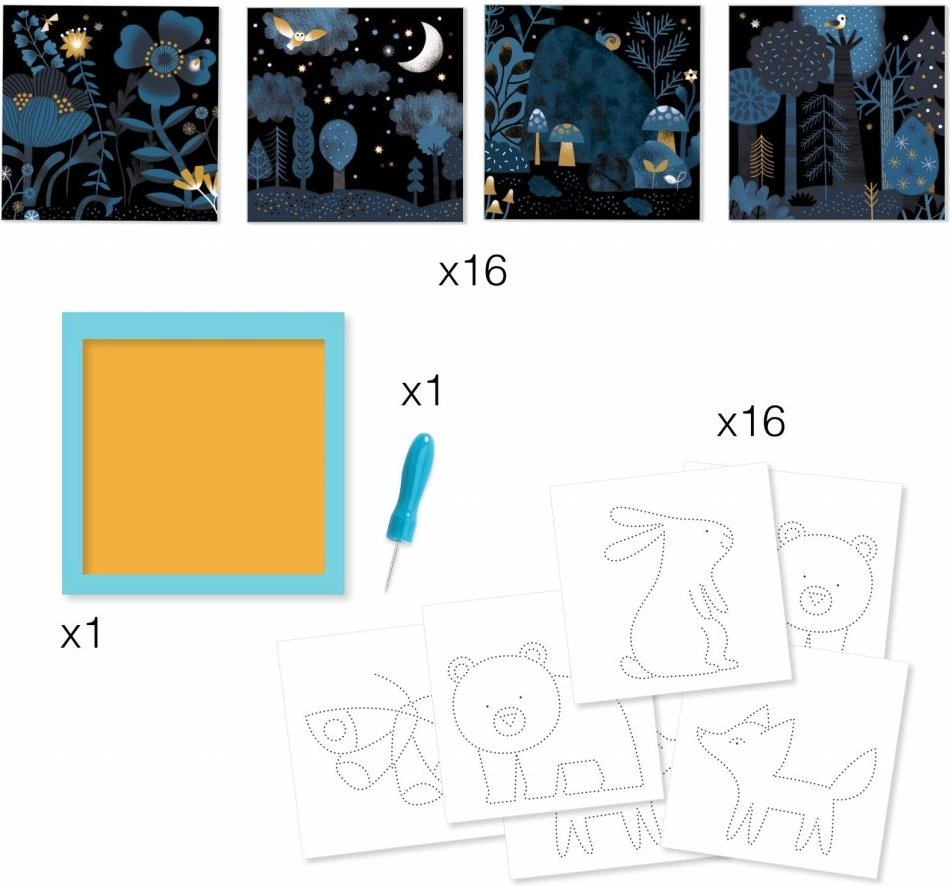 Komplektist leiate kõik vajaliku: 16 illustreeritud tausta, 16 šablooni, augustusnõela, robustse hoidiku ja illustreeritud juhendvihiku. Materjalid on paberist ja papist, FSC-sertifikaadiga, nii et meisterdamine on loov ning loodussõbralik.