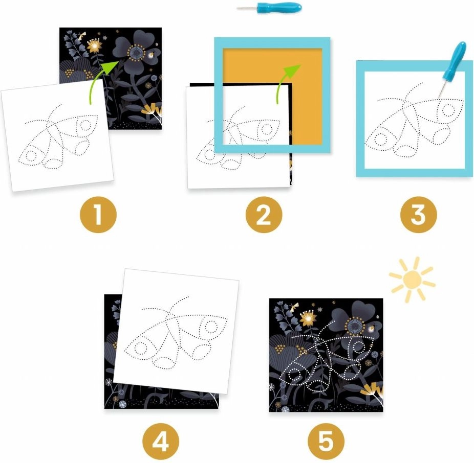 Avastage lõbus tegevus, mis on inspireeritud Montessori meetodist. Lapsed harjutavad turvaliselt keskendumist, täpsust ja surve tugevuse tunnetust, luues kauneid läbivalgustuspilte. Tugev vahtplastist ja papist hoidik hoiab alused stabiilselt paigal, mistõttu on väikestel loojatel lihtne ja kindel töötada.