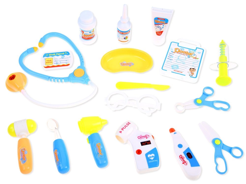 - Rikas komplekt: prillid, stetoskoop, termomeeter, valgusega otoskoop, vererõhumõõtja, neuroloogiline haamer, süstal, valgusega peegel, käärid, skalpell, ravipotid, patsiendikaart ja palju muud.