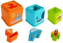 Värviline kandiliste tasside komplekt sõidukite motiividega lõbusaks õppimiseks. Lapsed harjutavad peenmotoorikat, silma–käe koordineerimist, loogilist mõtlemist ning värvide, kujundite ja numbrite tundmist. Igal tassil on sorteerimisava õige sõiduki sobitamiseks ja sellest saab ehitada kõrge püramiidi.