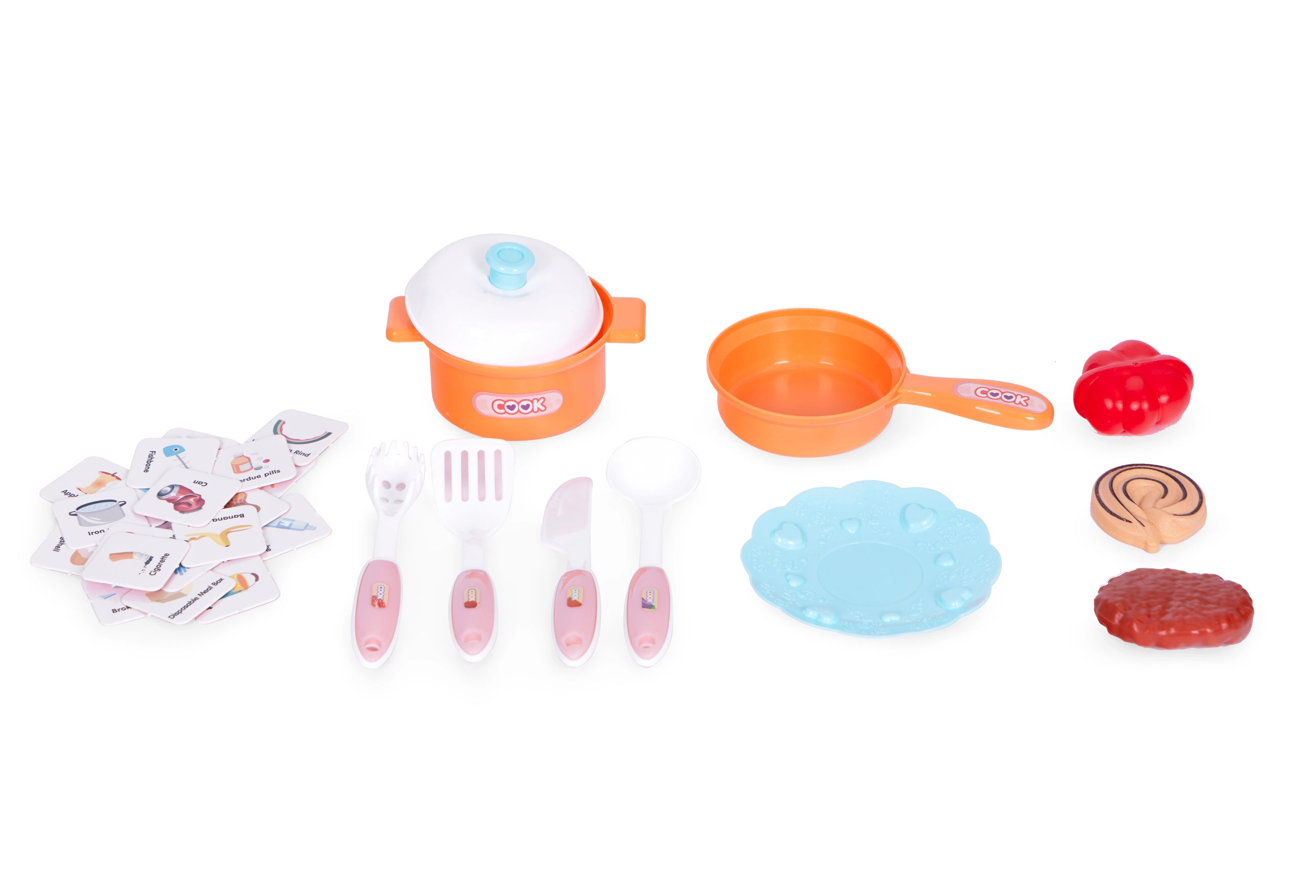 Pott, pann, taldrikud, söögiriistad ja mängutoidud on täiendatud puslega, mis õpetab jäätmete õiget sorteerimist – lõbus ühendatud õppimisega.