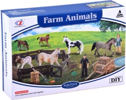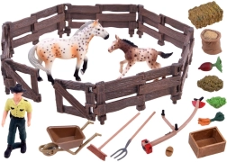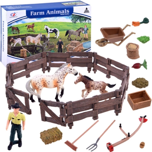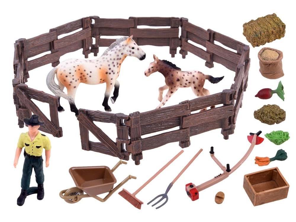 See rikkalik komplekt viib lapsed talumaailma. Seest leiad kaks loomutruult kujundatud hobusekujukest (mära ja varsakene), taluniku, aediku ning hulga tarvikuid nagu käru, hang, reha, söötur ja sööt. Realistlikud detailid, alates aia “puidu” tekstuurist kuni hobuste värvuseni, ergutavad fantaasiat ja pakuvad pikki mängutunde.