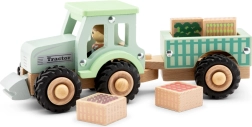 See kaunis komplekt sisaldab maheda rohelise tooniga traktorit, eemaldatavat järelhaagist ja nelja puidust plokki trükistega tomat, baklažaan, porgand ja brokoli. Lapsed saavad köögivilju peale laadida, vedada ja maha laadida, harjutada silma-käe koordinatsiooni ning avastada taluelu maailma.