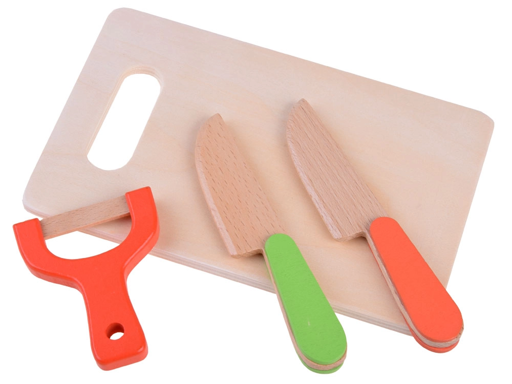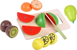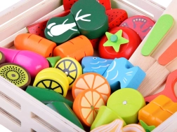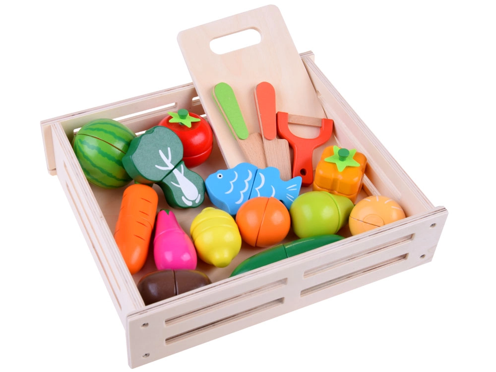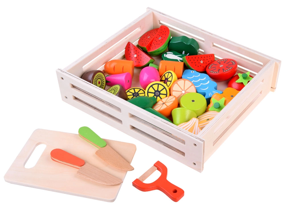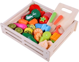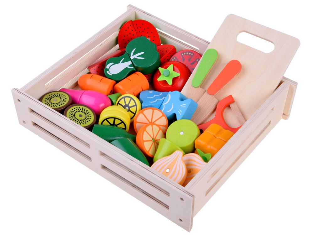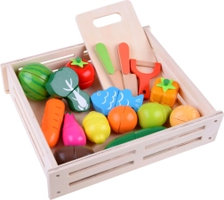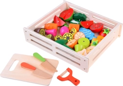 Komplekti sisu: Puidust kast, lõikelaud, kahepoolne nuga, koorija, erinevad puu- ja köögiviljad, nagu tomat, porgand, kurk, paprika, maasikad, kiivi ja teised.