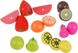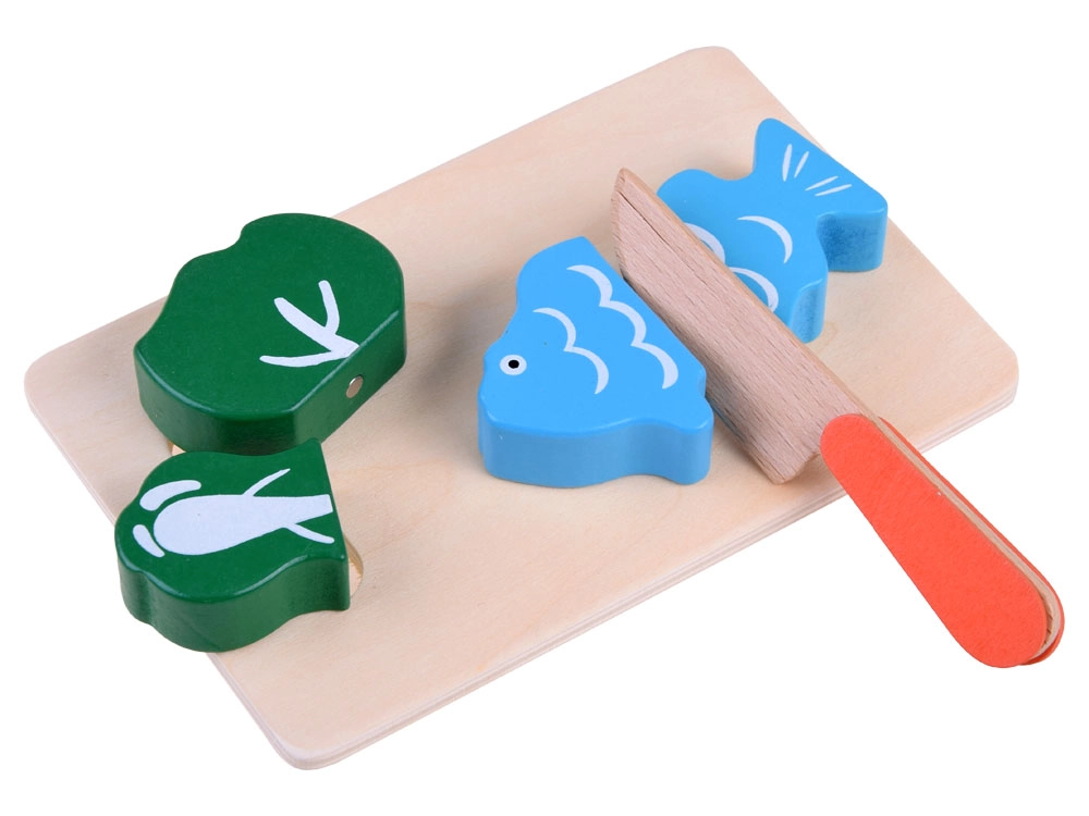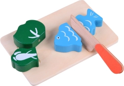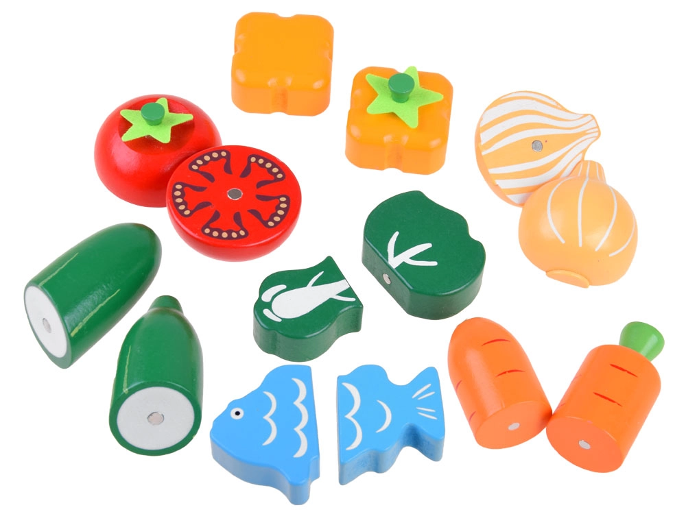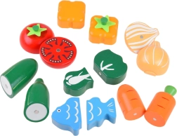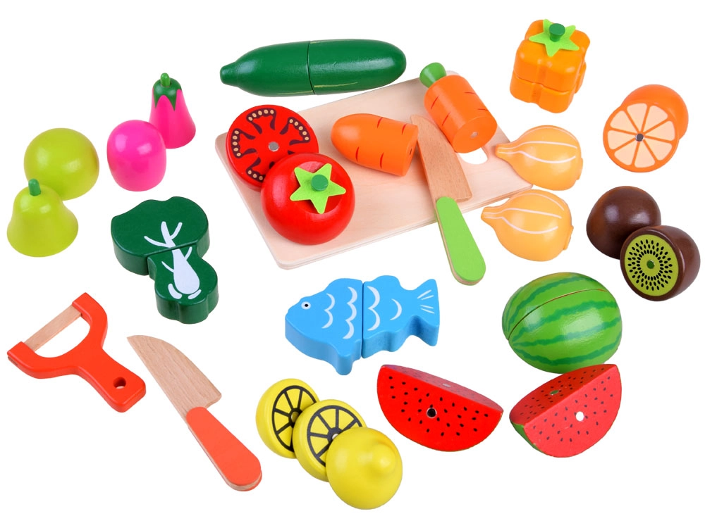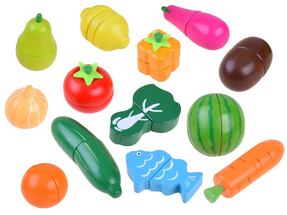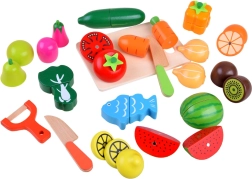 See puidust komplekt sisaldab mitmekesist valikut puu- ja köögivilju ning kala, kõik varustatud magnetitega, et oleks lihtne neid osadeks jagada. Iga tükk on valmistatud kvaliteetsest puidust ja värvitud mittetoksiliste värvidega, mis tagavad turvalisuse ka kõige pisematele.
