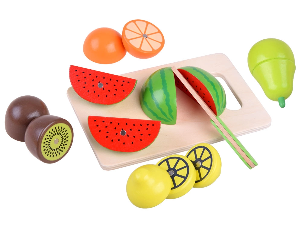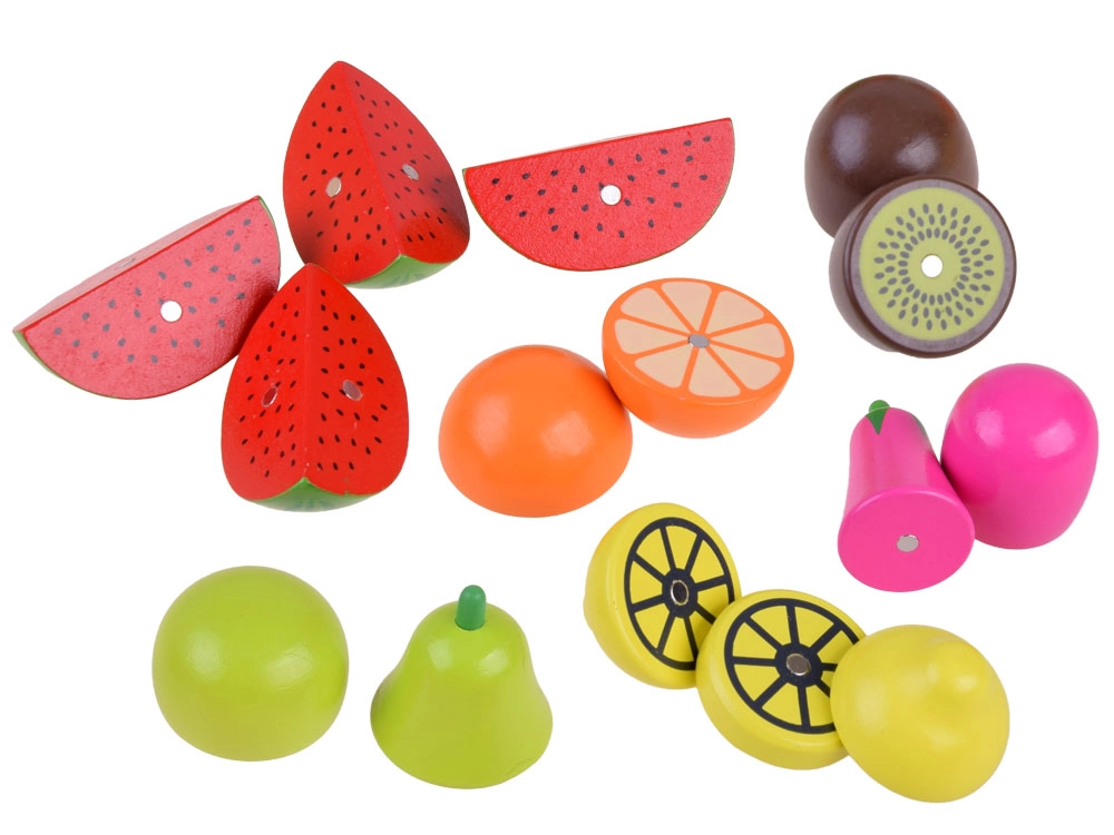 Iga puu- ja köögiviljatükk on varustatud magnetiga, mis võimaldab neid realistlikult osadeks jagada.