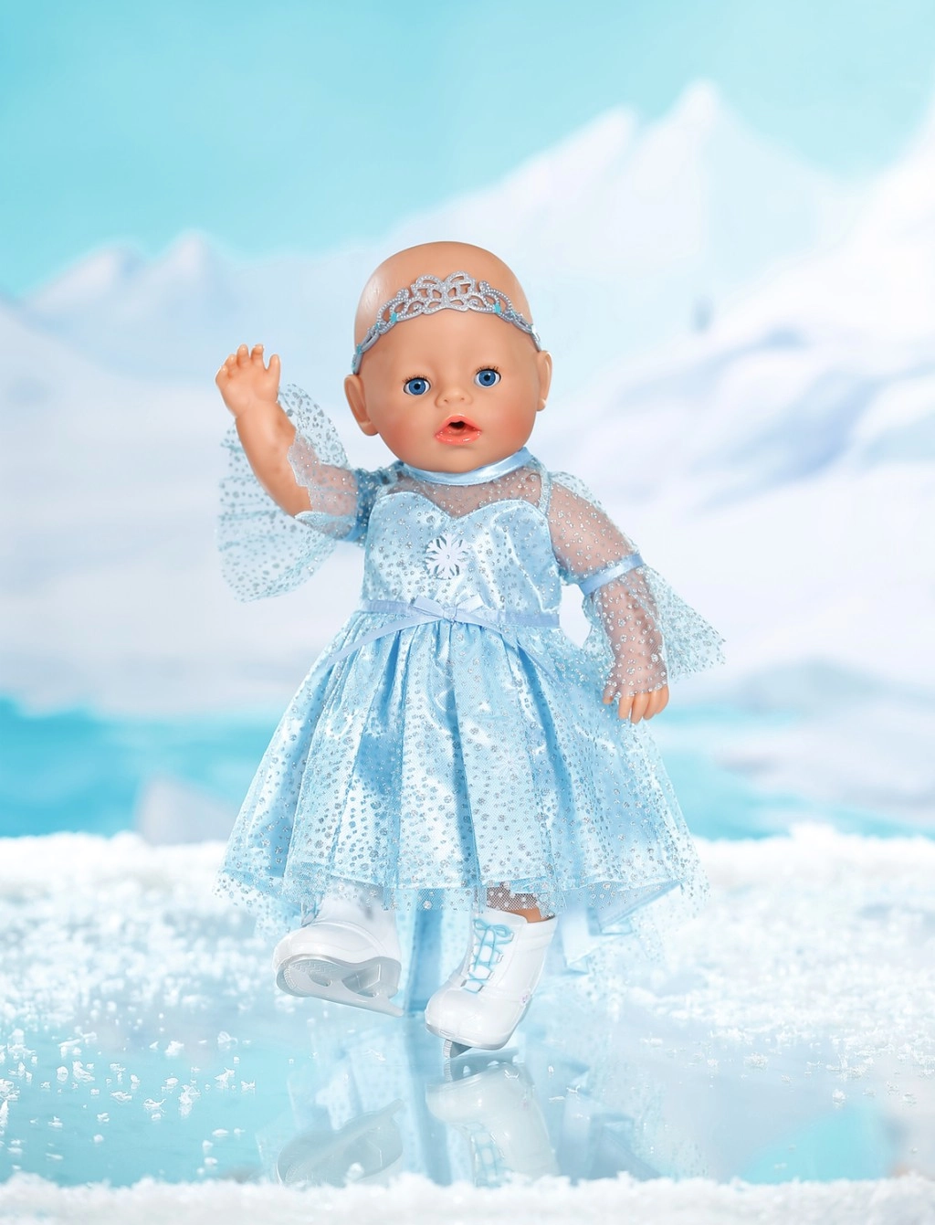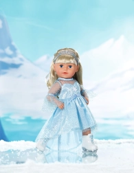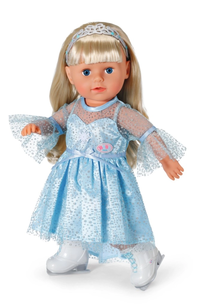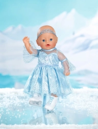 Elegantne komplekt BABY born 43 cm nukkudele toob igapäevasesse mängu talvise kuningriigi võlu. Kerged säravad kleidid õrna kattelooriga on lihtsasti selgajatavad ning diadeem hoiab soengu paigal ka iga pirueti ajal. Valged uisustiilis kingad toetavad fantaasiat ja laste lugusid iluuisutamisest.