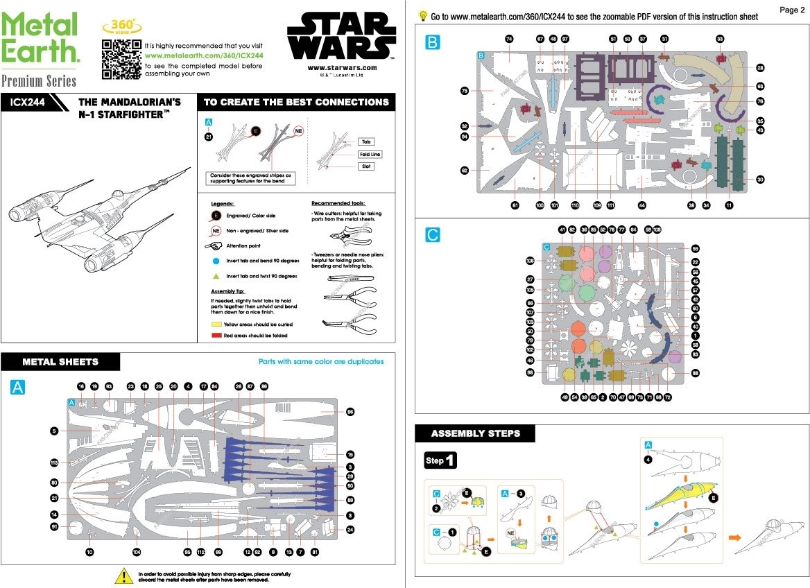 Pane kokku ikooniline N‑1 hävitaja sarjast Star Wars Metal Earth Premium väljaandes. Roostevabast terasest lehtedest lood detailse metallist 3D mudeli koos lasergraveeringuga, mis sobib suurepäraselt nii stiilseks dekoratsiooniks kui ka kollektsiooni. Ehitamine nõuab kannatlikkust ja vilumust, kuid tasuks on realistlik tulemus, mis väärib väljapanekut.