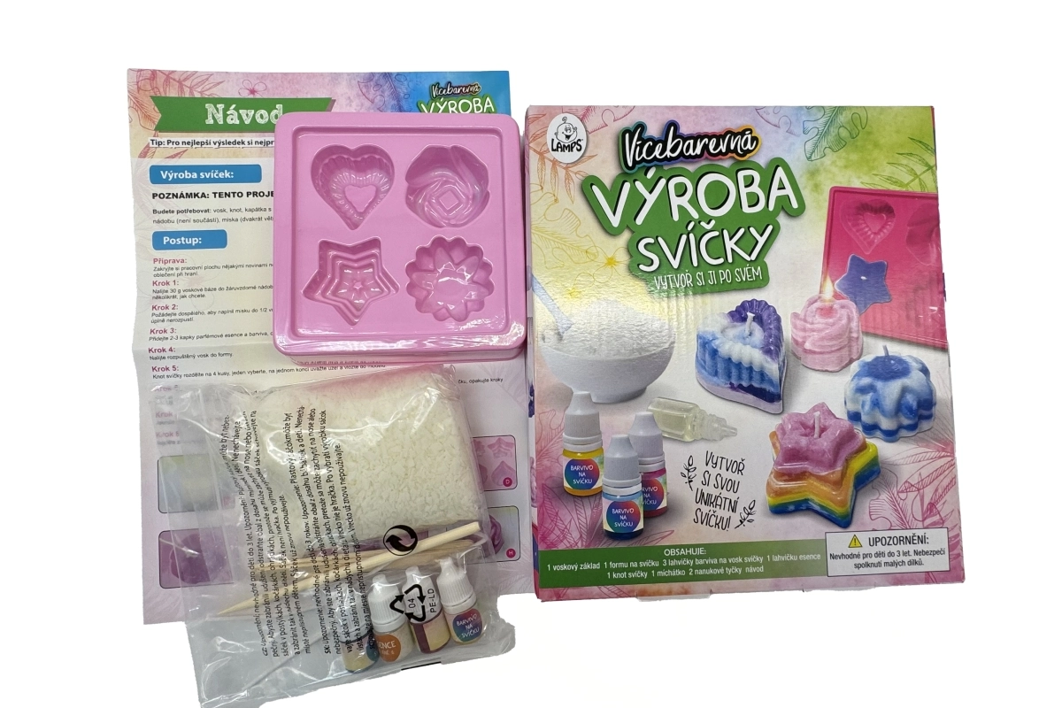 Pakendis on kõik vajalik – alates vahast ja tahist kuni vormi, värvaine ja essentsini. Praktilised abivahendid, nagu segamispulk ja pulgad, teevad töö lihtsamaks ja aitavad hoida meisterdamise käigus korra. Pakendi mõõt umbes 20 × 23 × 5 cm on ideaalne ka kingituseks.