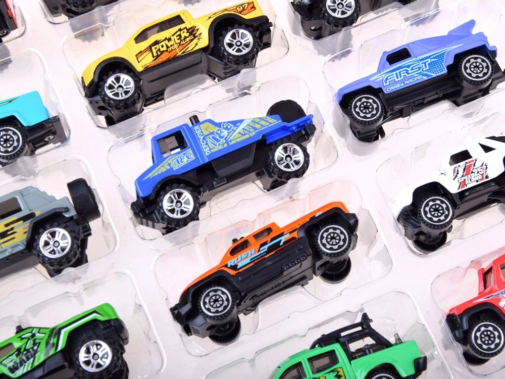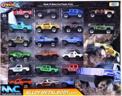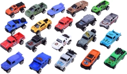 Suur 20 metalldiega mudelautode komplekt rõõmustab nii väikseid kollektsionääre kui ka võidusõidufänne. Mudelitel on metallist kered plastikust šassiil, komplektis on maasturid ja pikapid detailse teostuse ja pilkupüüdva graafikaga. Iga mudeli pikkus on ligikaudu 7,5–8 cm.