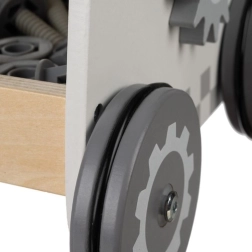 Tugev puidust konstruktsioon, ümarad servad ja kummiga kaetud rattad vaikseks ja kindlaks sõiduks toas. Materjalid on sõbralikud nii lastele kui ka loodusele.
