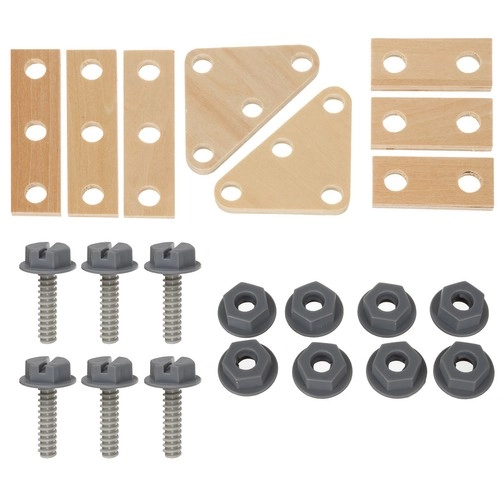 - Rikas komplekt: haamer, kruvikeeraja, mutrivõti, kruvid, mutrid, latid, kruustang ja kujundid sorteerijasse