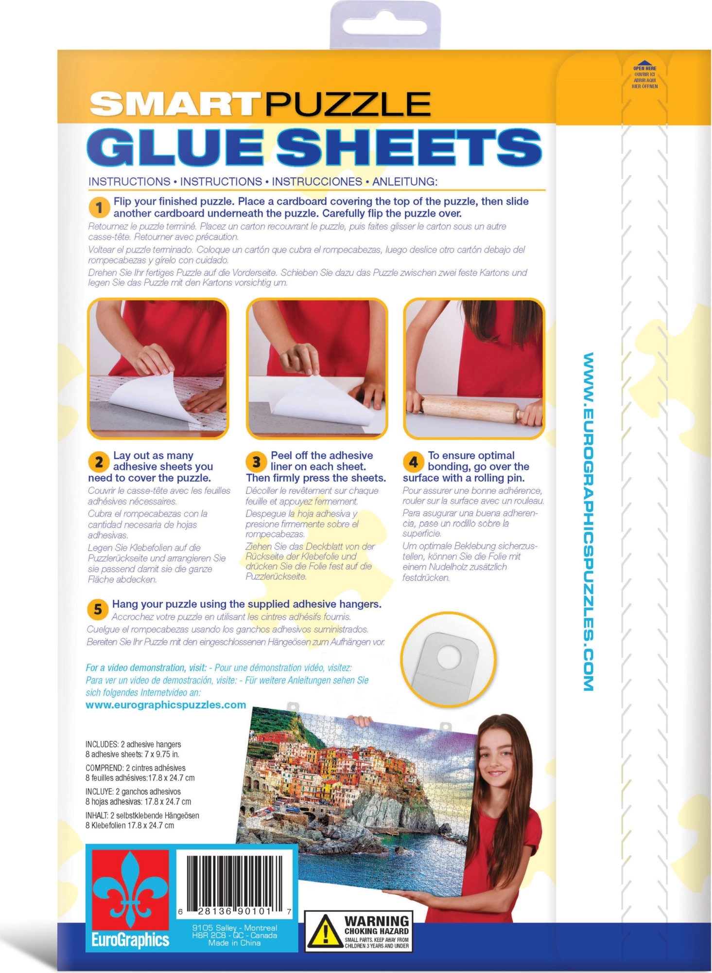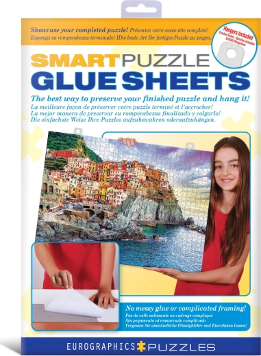 Soovid oma lemmikpuslet eksponeerida? EUROGRAPHICS Smart Puzzle Glue Sheets pakub lihtsat ja puhast lahendust. Isekleepuvad kilelehed hoiavad tükid kindlalt koos ning kaks konksu võimaldavad mugavalt seinale riputada.