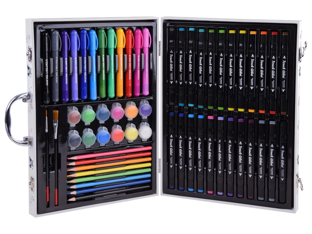Avasta loominguline maailm selle suure joonistuskomplektiga praktilises kohvris. Komplekt sisaldab vildikaid, peeneid markereid, värvipliiatseid, akvarellvärve ja pintsleid – kõik on selgelt paigutatud ja valmis loomiseks nii kodus kui ka teel. Arendab laste peenmotoorikat, loovust ja kontsentratsiooni.