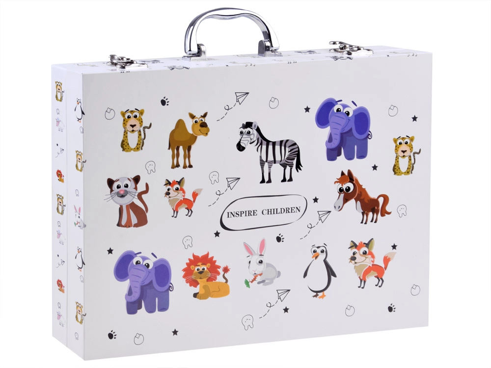 See rikkalikult varustatud komplekt väikestele kunstnikele pakub kõike, mida lapsed vajavad maalimiseks ja joonistamiseks. Kompaktset, lõbusate loomamotiividega kohvrit on tänu tugevale käepidemele lihtne kaasas kanda, nii et loomisvahendid on alati käepärast – kodus, reisil ja koolis.