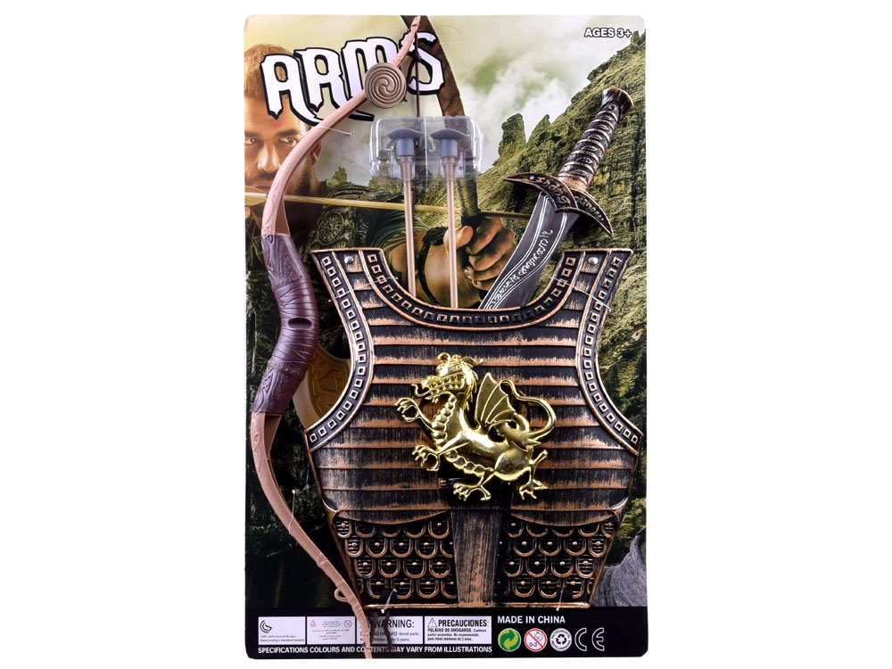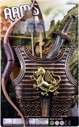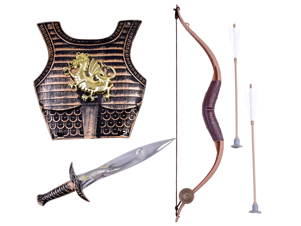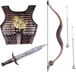 Komplekt sisaldab soomust, vibu, kahte noolt ja mõõka – ideaalne kombinatsioon fantaasialahinguteks ja karnevalikostüümideks.