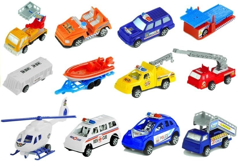 Komplektis on politseiauto, päästjad, tuletõrjeauto väljatõmmatava redeliga, buss, tööautod ning haagised pagasi ja paadiga.