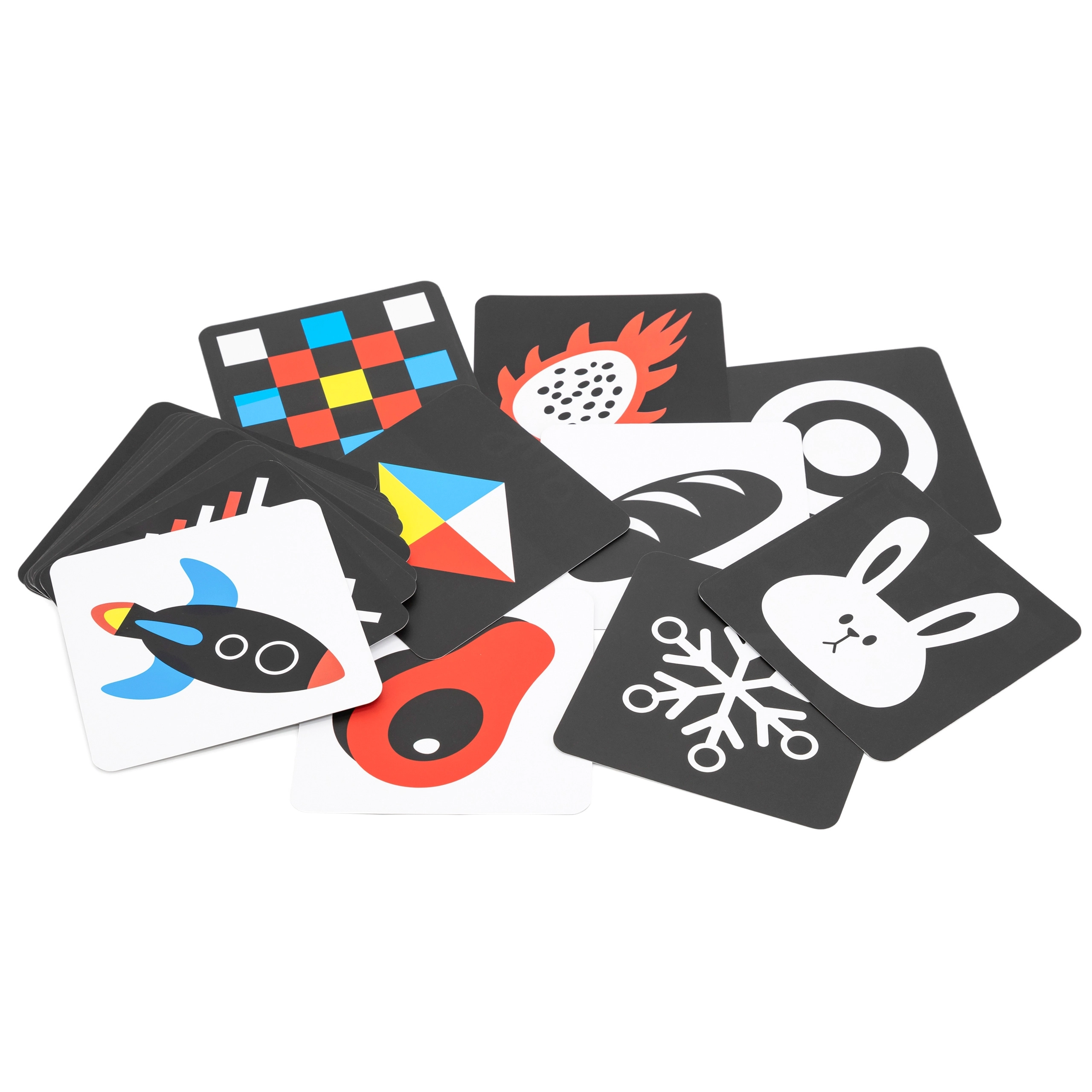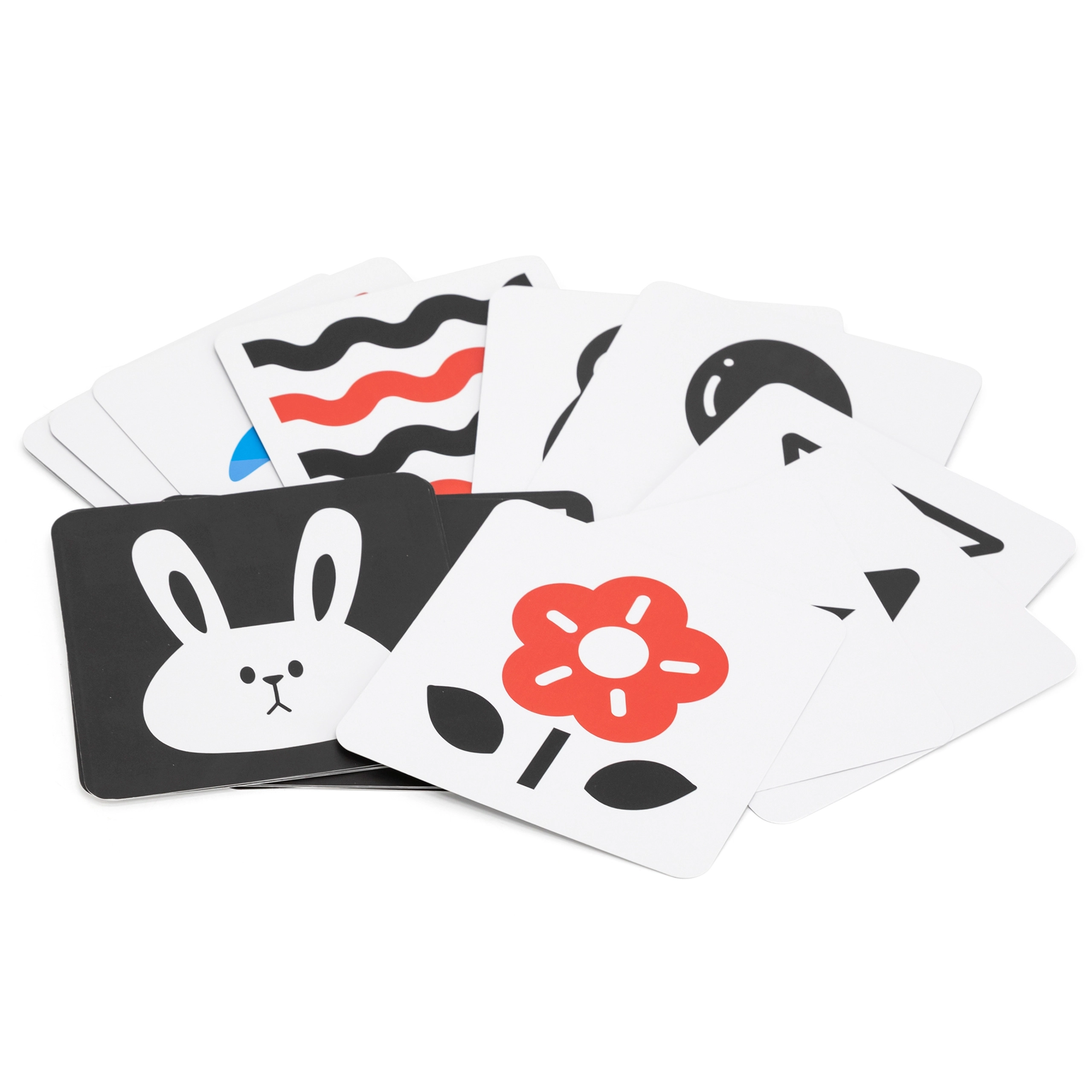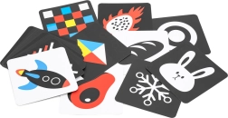 Mustvalgete ja punavalgete kaartide seeria lihtsate kujundite ja piltidega köidab loomulikult beebi pilku. Toetab fikseerimist, objekti jälgimist ja varajast visuaalset taju – ideaalne vastsündinutele ja noorematele imikutele.