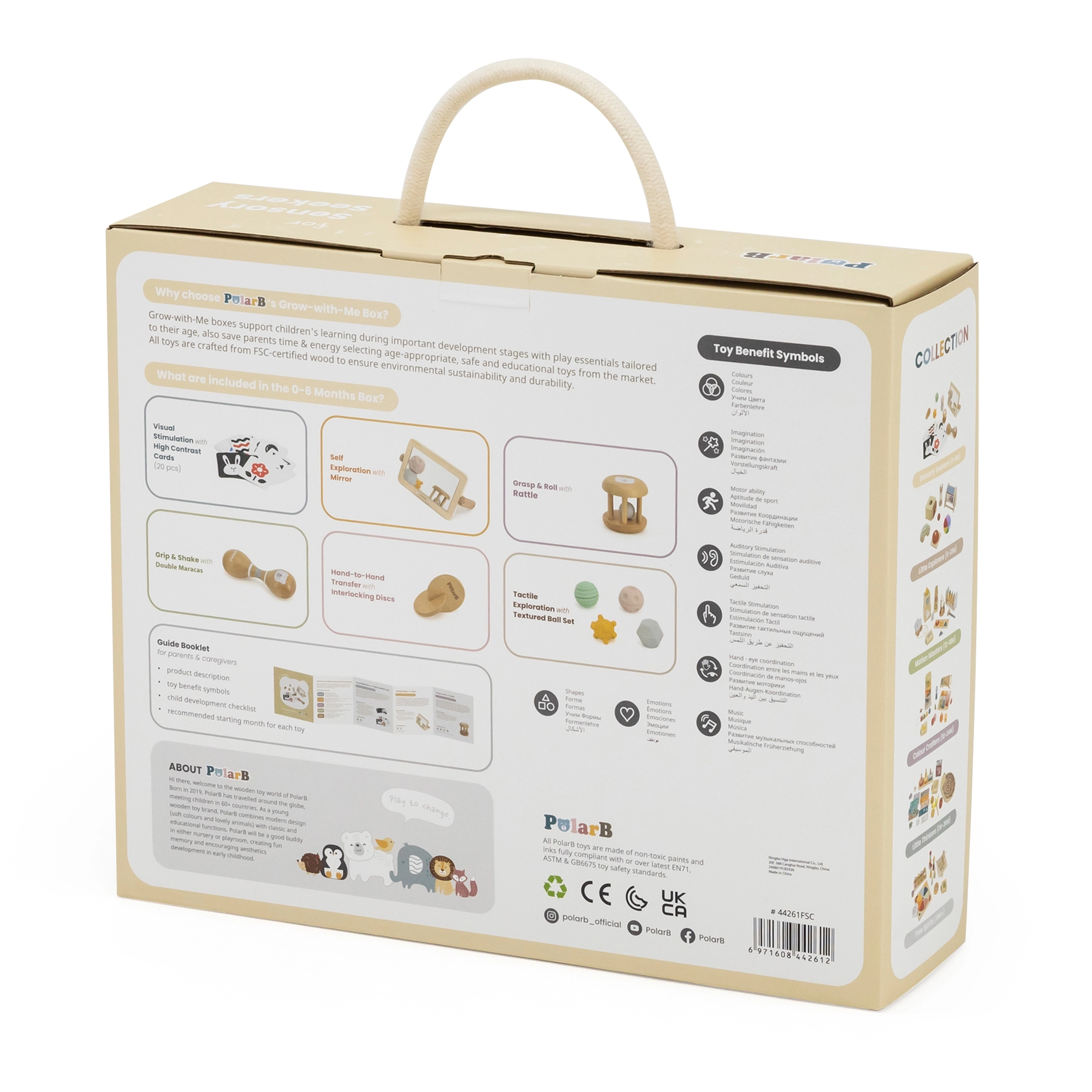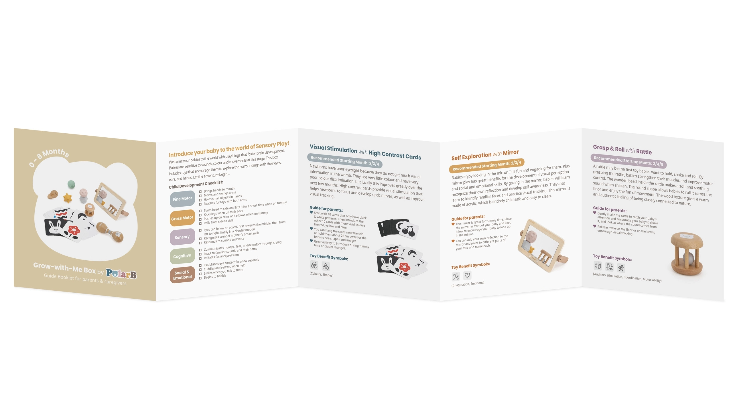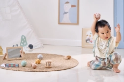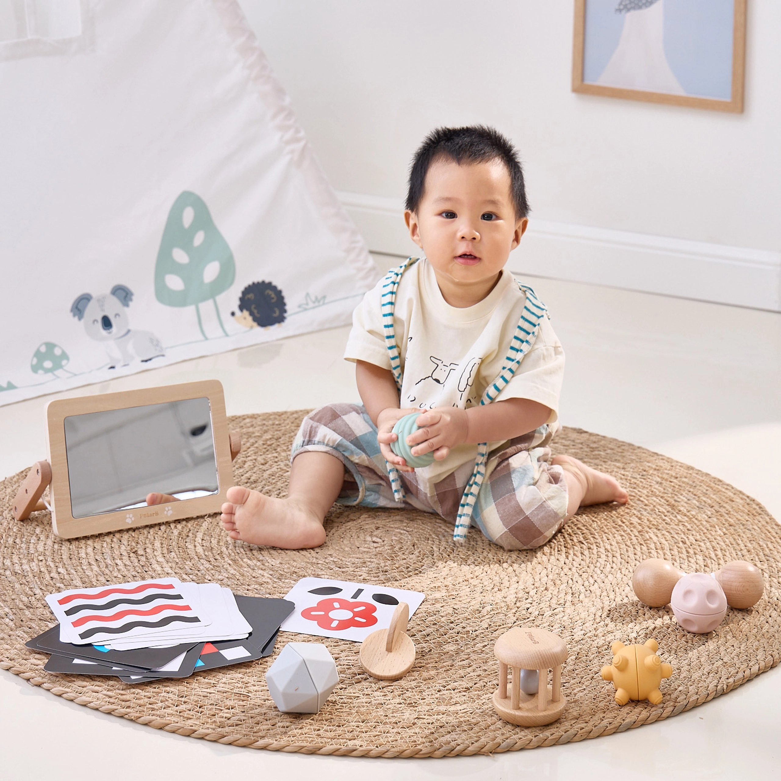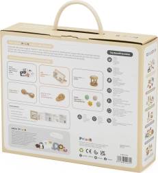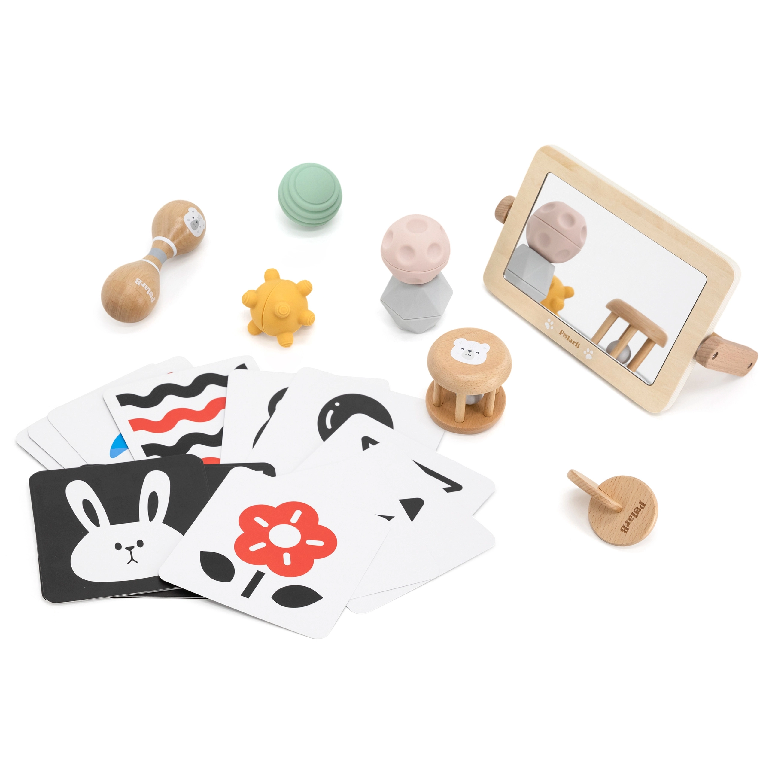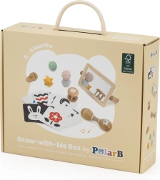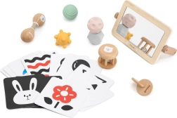Hoolikalt koostatud komplekt toetab beebi loomulikku arengut esimestest elupäevadest. Kõrge kontrastsusega kaardid treenivad pilgu fikseerimist ja kujundite tajumist, puidust peegel aitab eneseavastamisel ja tummy time’il, kõristid ja marakad arendavad rütmitunnet, kuulmist ja koordinatsiooni. Erinevad tekstuurid ja vormid taktiilsetel pallidel stimuleerivad peen- ja üldmotoorikat ning tugevdavad haaret.