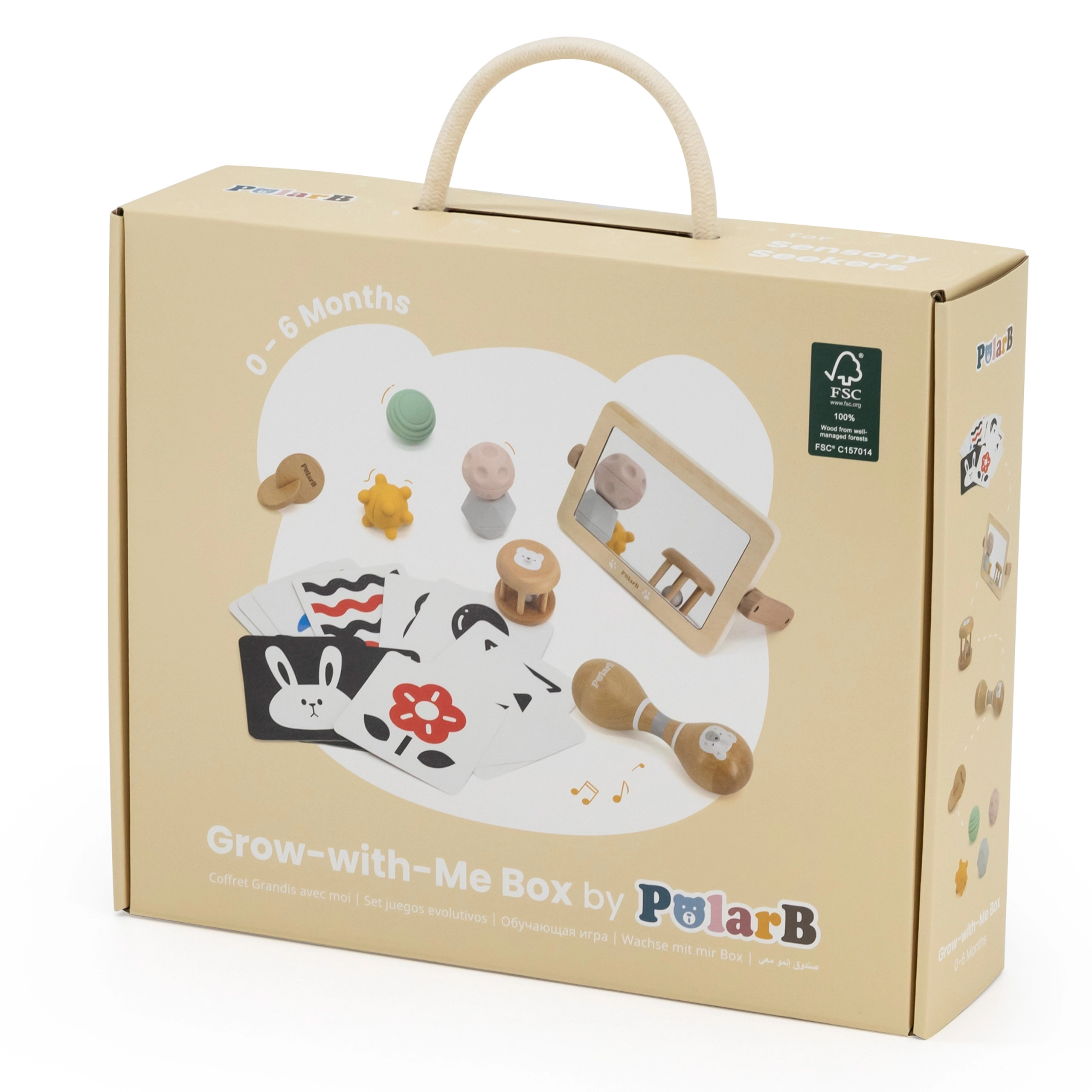 Komplektne sensoorne komplekt kõige pisematele vanuses 0–6 kuud arendab nägemist, kuulmist ja kompimist tänu läbimõeldud abivahendite kombinatsioonile. Seest leiad kontrastkaardid, puidust peegli, kõristid ja taktiilsed pallid kvaliteetsetest materjalidest, sh FSC-sertifikaadiga puit. Komplekt on kohe kasutusvalmis ja sobib suurepäraselt ka kingituseks.