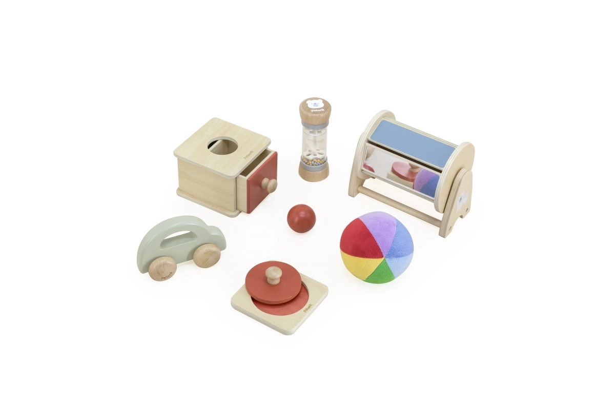 Komplekt kõige pisematele alates 6–12 kuud ühendab puidust ja sensoorseid mänguasju lõbusaks õppimiseks. Toetab meelte arengut, silma‑käe koordineerimist ning peen- ja üldmotoorikat. Ergonoomilised vormid, ohutud materjalid ja Montessori põhimõtted innustavad beebit iga päev maailma avastama.