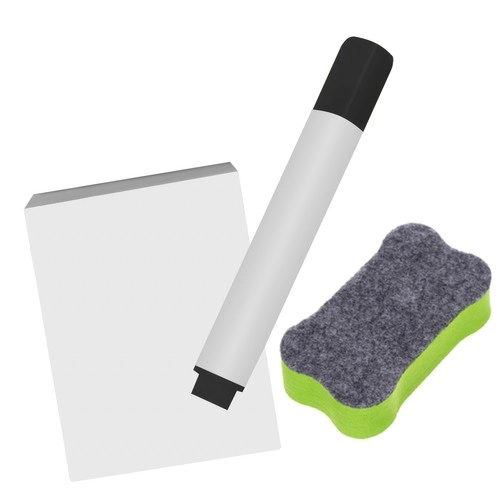 Komplektis on tarvikute riiul ja stardikomplekt: värvilised kriidid, marker ja käsn koheseks kasutamiseks.