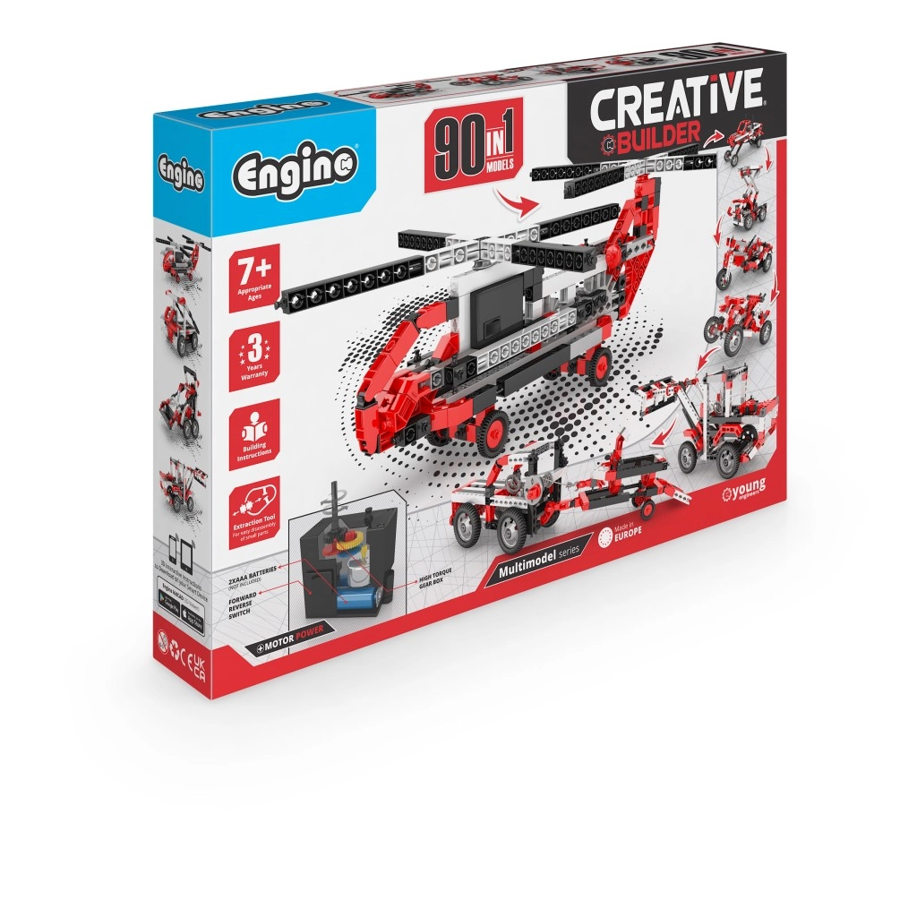 Avastage lõputuid ehitusvõimalusi komplektiga ENGINO Creative Builder 90 ühes koos mootoriga mudelite liigutamiseks. Ühest komplektist saab kokku panna kuni 90 erinevat mudelit – autodest ja mootorratastest kuni lennukite ja kopteriteni. Tänu interaktiivsele rakendusele kidCAD 3D saate mudeleid pöörata, suumida ning õppida samm-sammult. Sobib alates 7. eluaastast, ühilduv teiste ENGINO komplektidega.