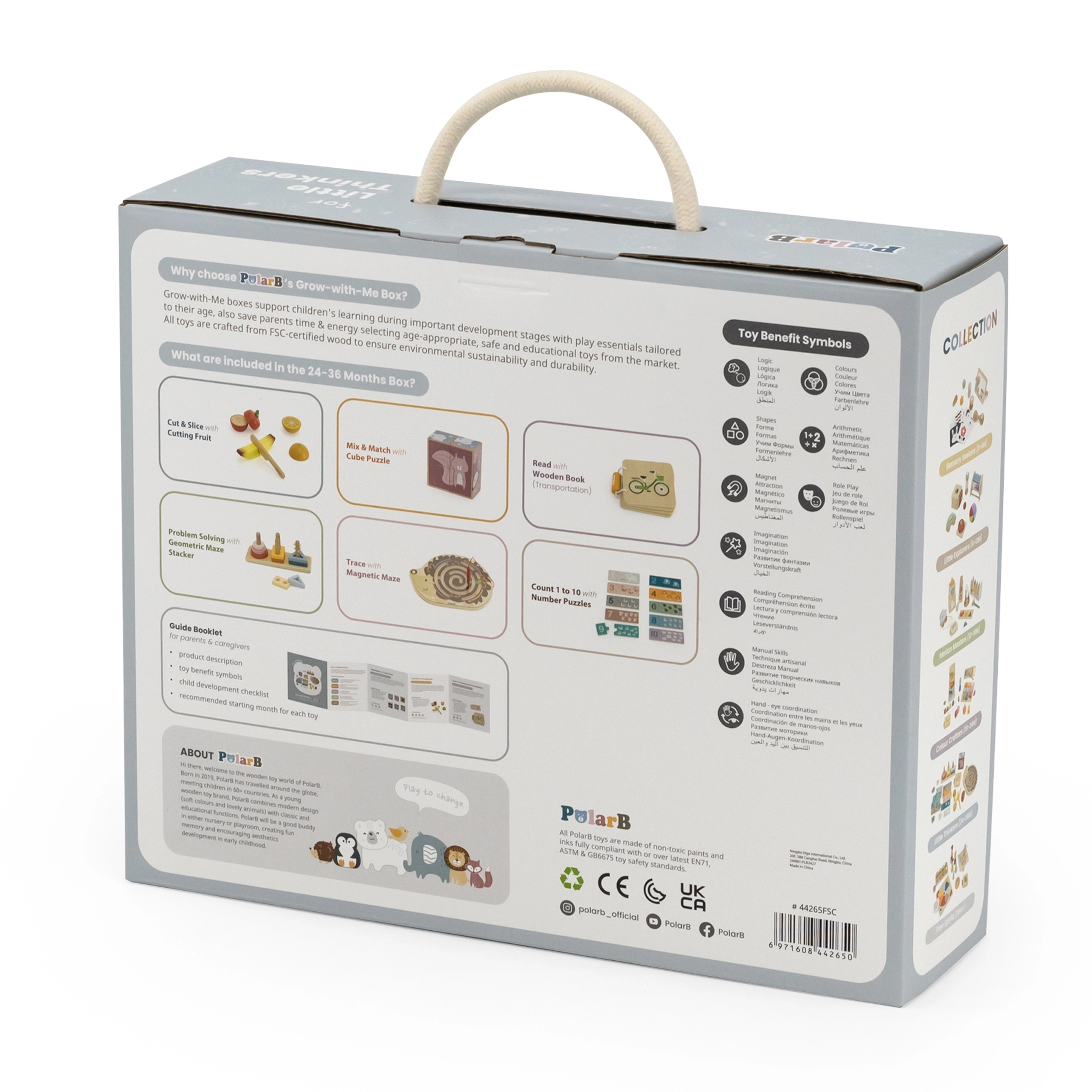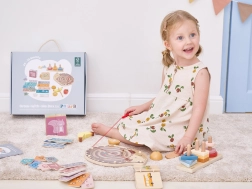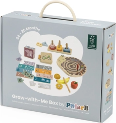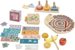 Komplektis on magnetiline siililabürint, klotsid ja pusled, lõigatavate puuviljade komplekt ning puidust pildiraamat liiklusvahenditega. Kõik on paigutatud praktilisse käepidemega karpi lihtsaks kandmiseks. Ideaalne valik väikestele avastajatele, kes on valmis keerukamateks ülesanneteks.