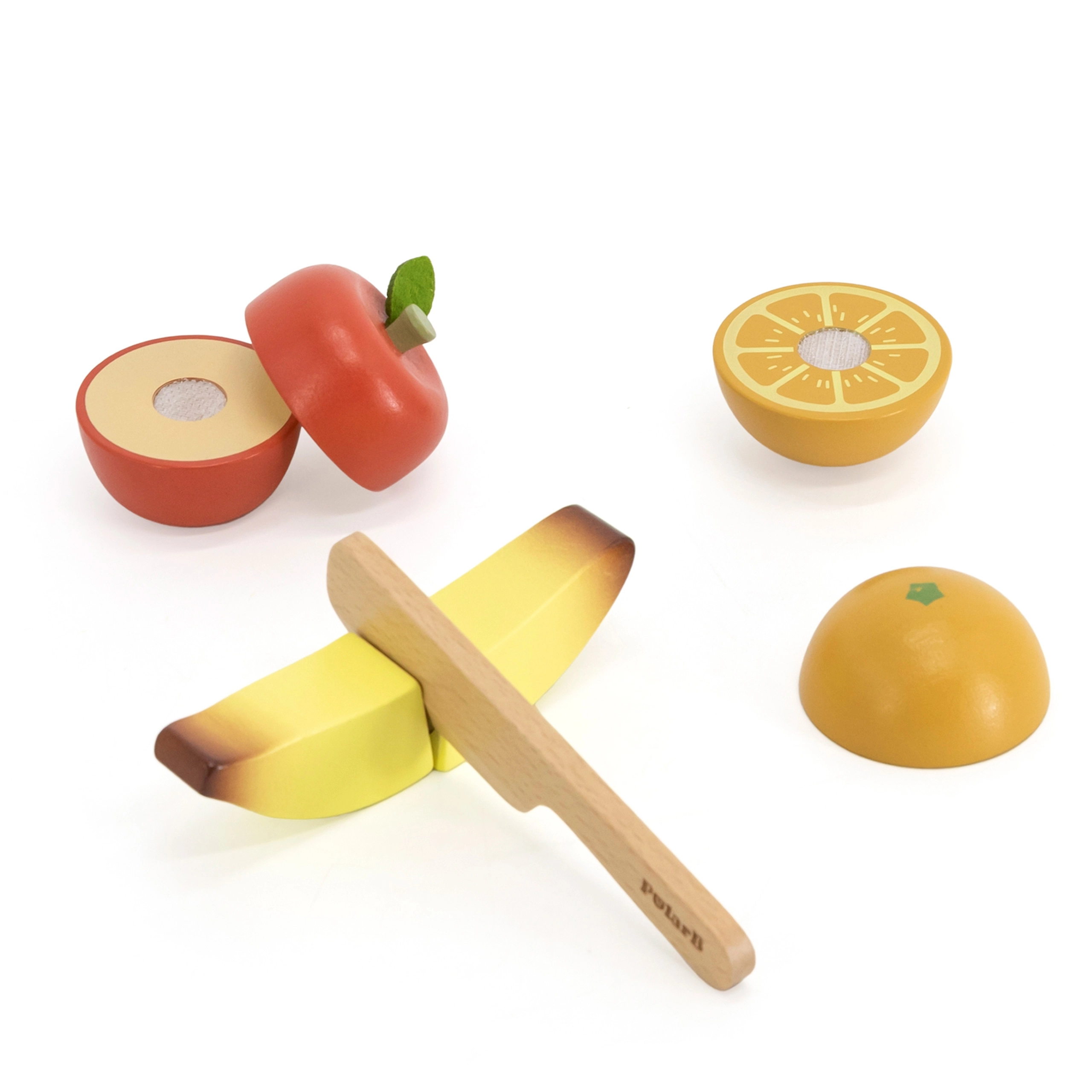 Takjapaelaga ühendatud puidust puuviljad noakesega arendavad peenmotoorikat, koordinatsiooni ja sotsiaalseid oskusi kokamängus või poes mängides.