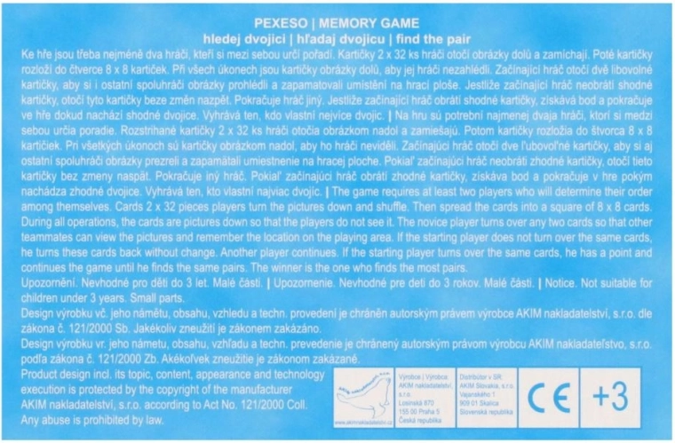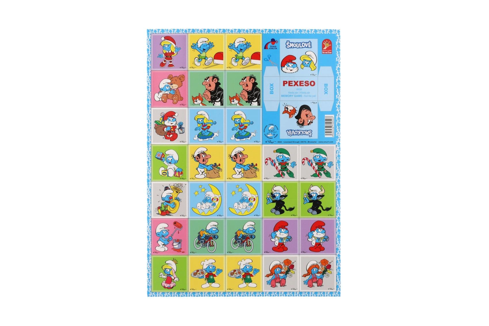 Pexeso Smurfid toob armastatud mälumängu siniste kangelaste motiividega. Tänu kvaliteetsele jäigale kartongile ja läikivale veehülgavale pinnale peab see vastu sagedasele mängimisele ka laste kätes. Kaartide mõõt 4 × 4 cm on mugav käsitsemiseks ja selgeks paigutamiseks.