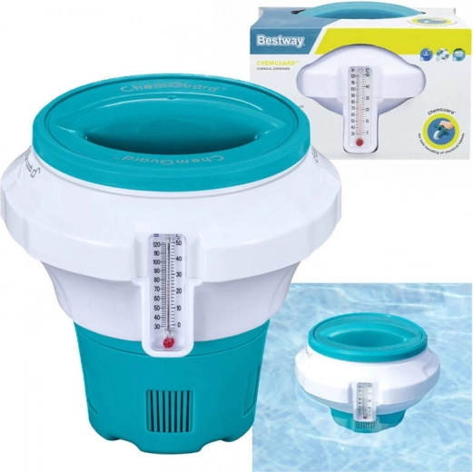 Hoidke basseini ja mullivanni vesi täiuslikult puhas ja ohutu. BESTWAY CHEMGUARD ujuv keemiadoosija koos integreeritud termomeetriga võimaldab täpset kloori või broomi doseerimist, sellel on reguleeritav vabastus, lapsekindel lukk ja lihtne temperatuuri lugemine nii °C kui ka °F.
