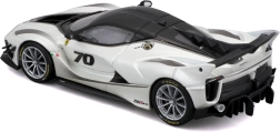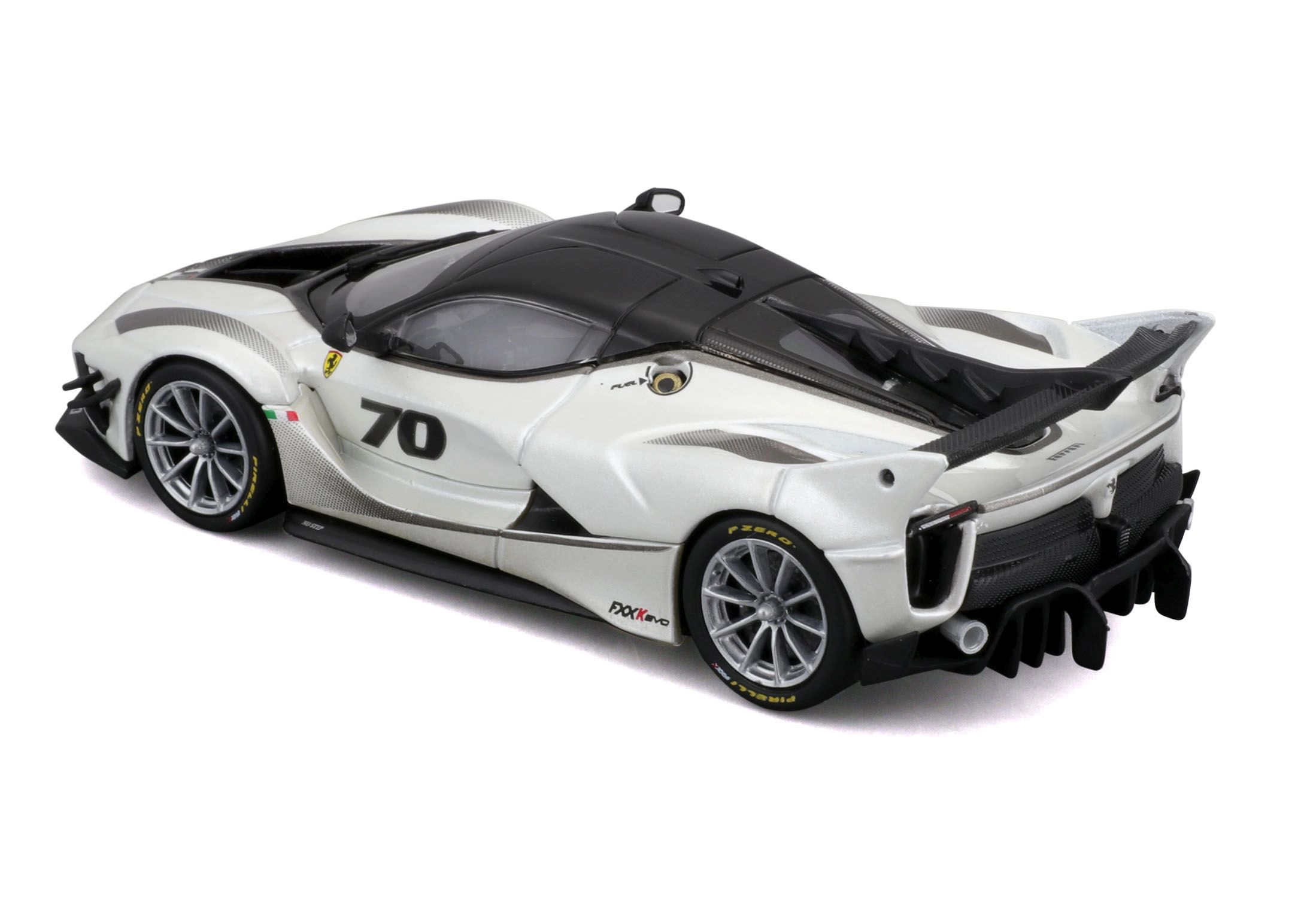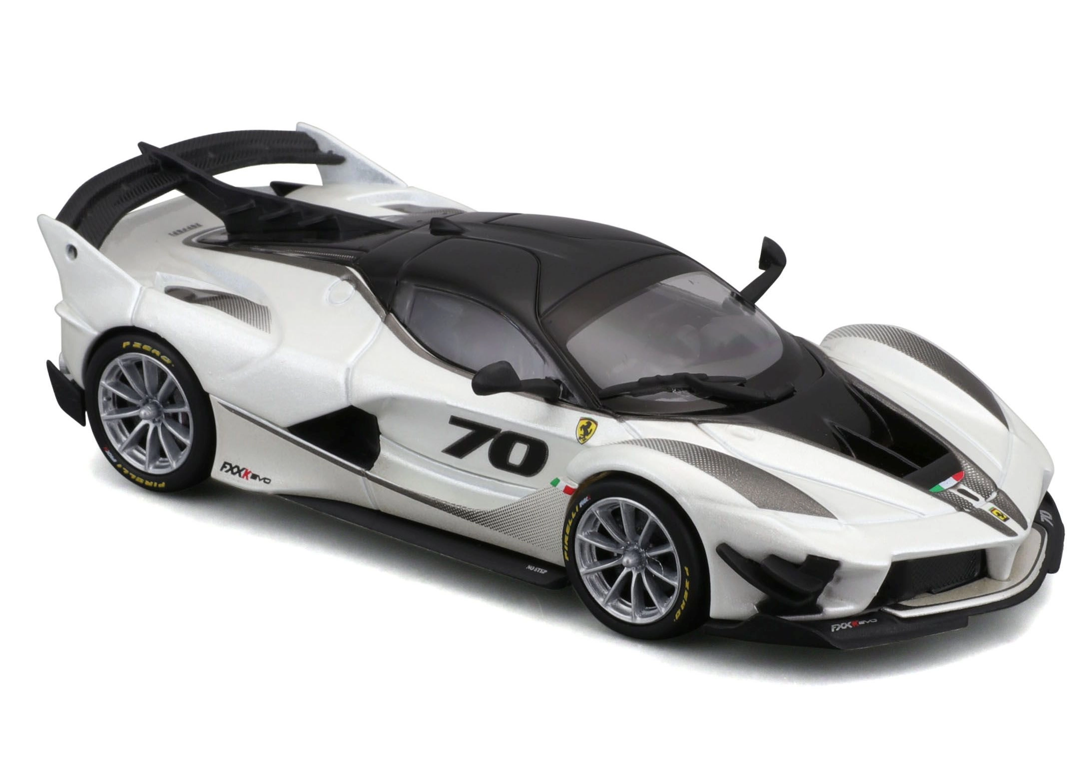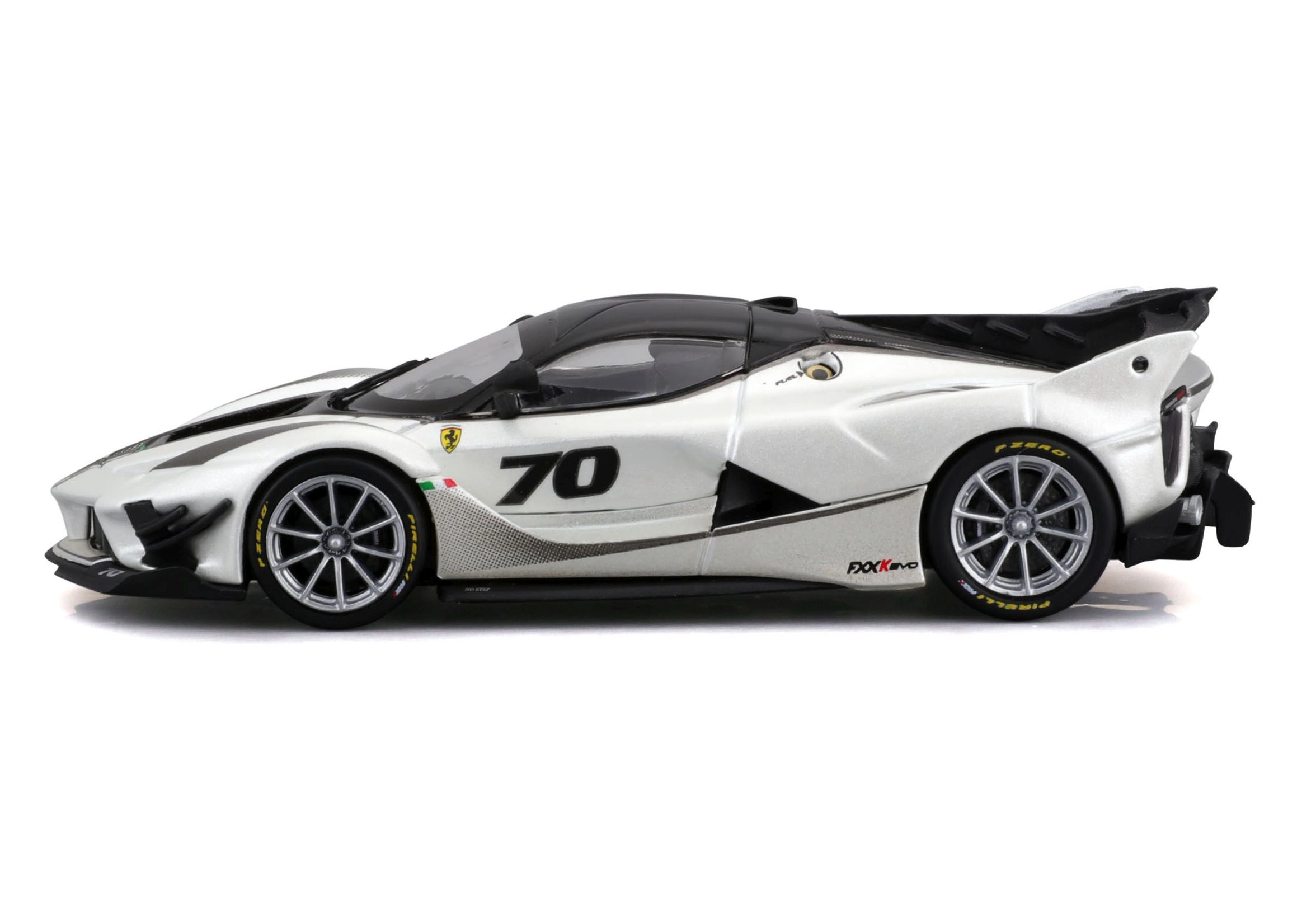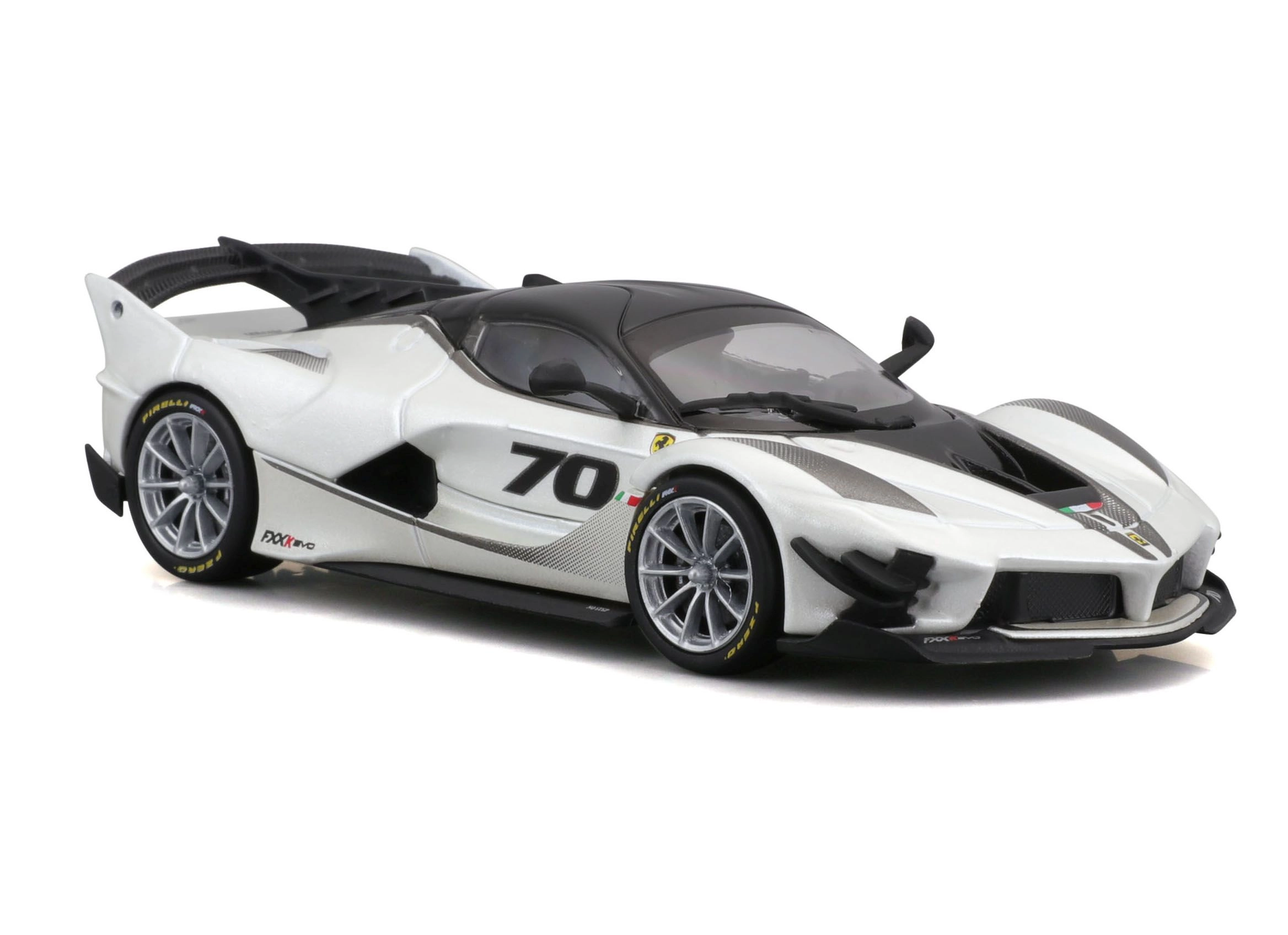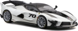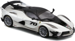 Detailirohke Ferrari FXX-K EVO 2017 mudel pakub realistseid proportsioone, teravaid kereliine ja võidusõiduelemente nagu suur tagatiiv, difuusor ja esisplitterid. Valge-must teostus numbriga 70 rõhutab ringraja erimudeli autentset välimust.