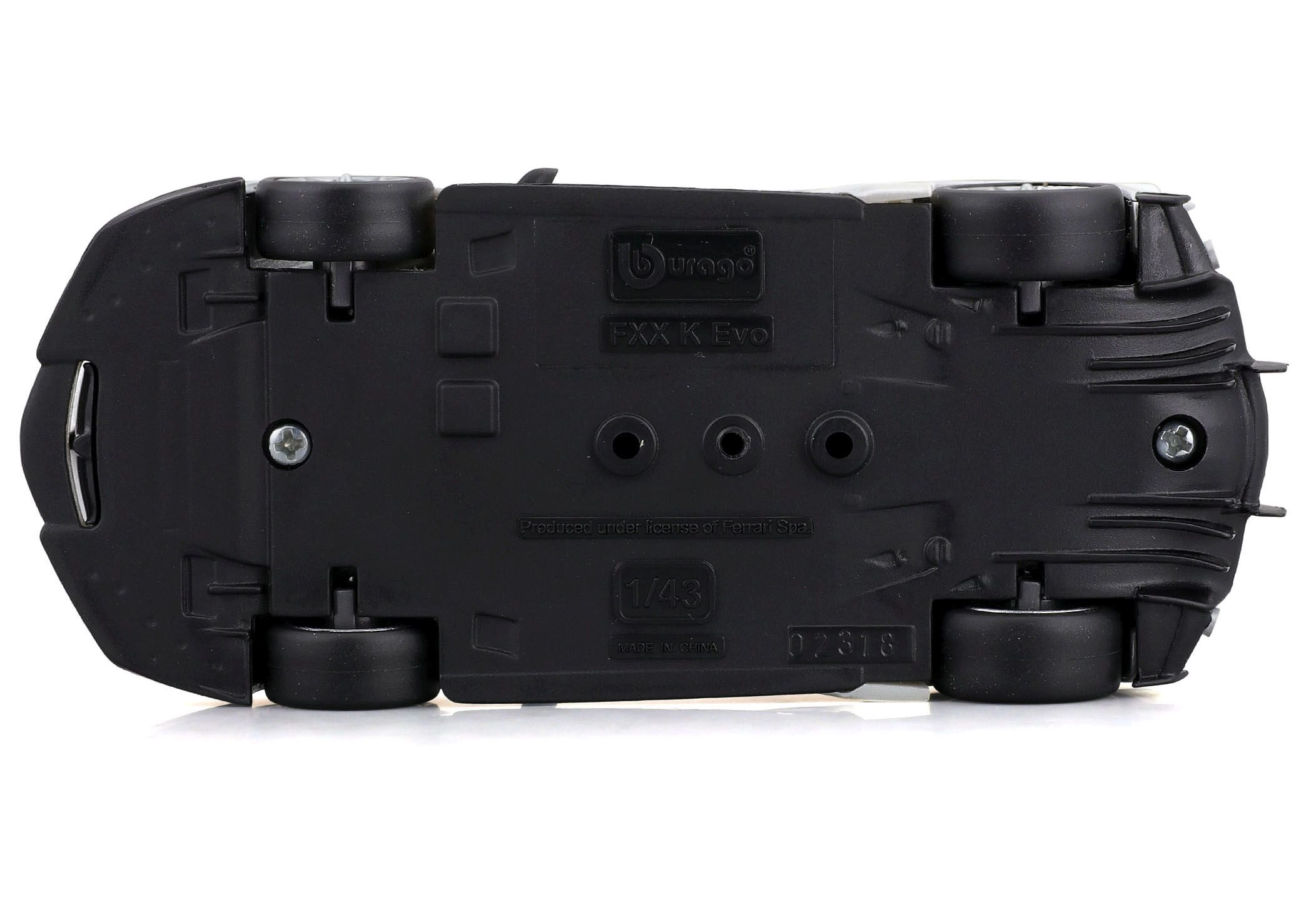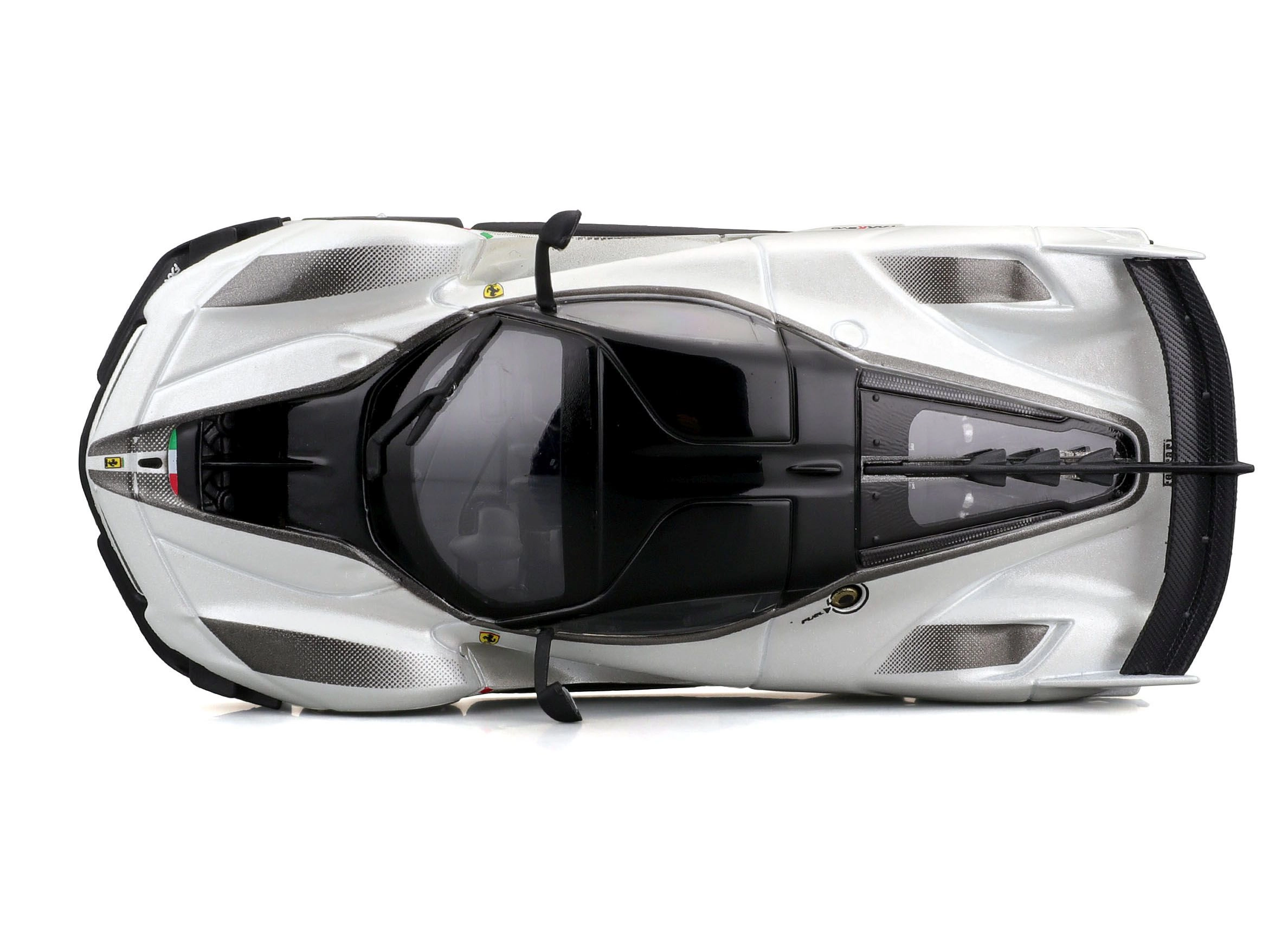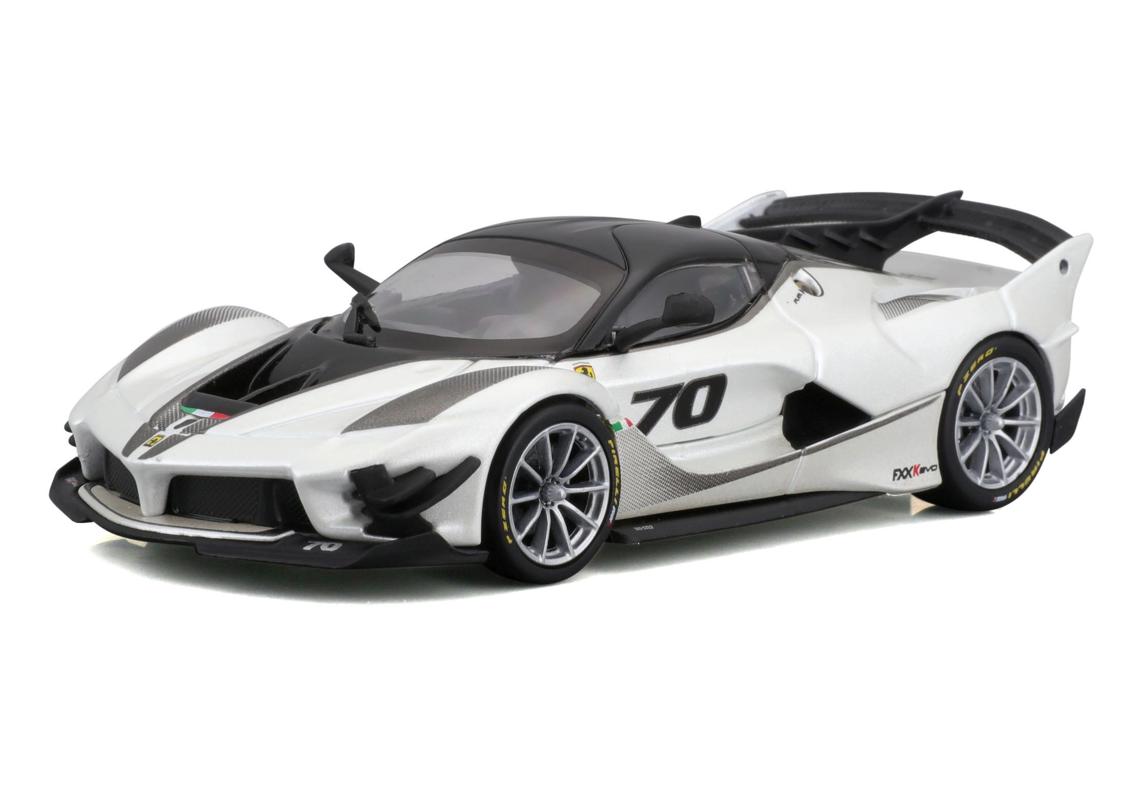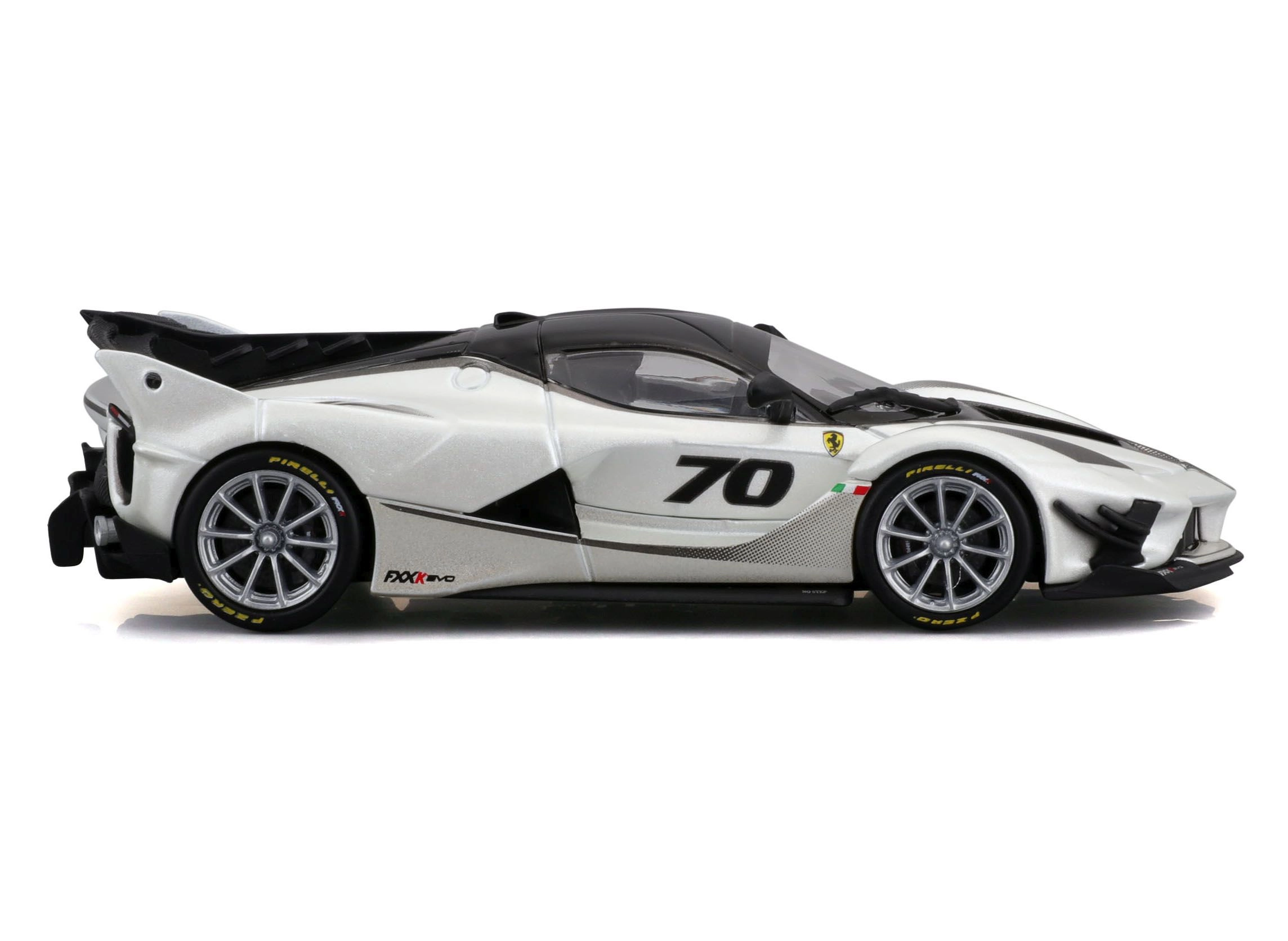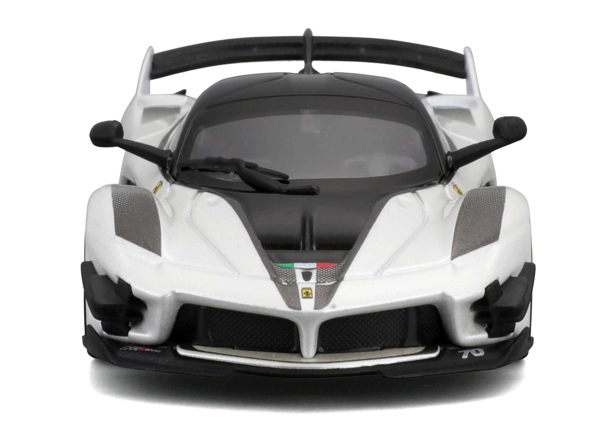 Detailirohke Ferrari FXX-K EVO 2017 mudel pakub realistseid proportsioone, teravaid kereliine ja võidusõiduelemente nagu suur tagatiiv, difuusor ja esisplitterid. Valge-must teostus numbriga 70 rõhutab ringraja erimudeli autentset välimust.