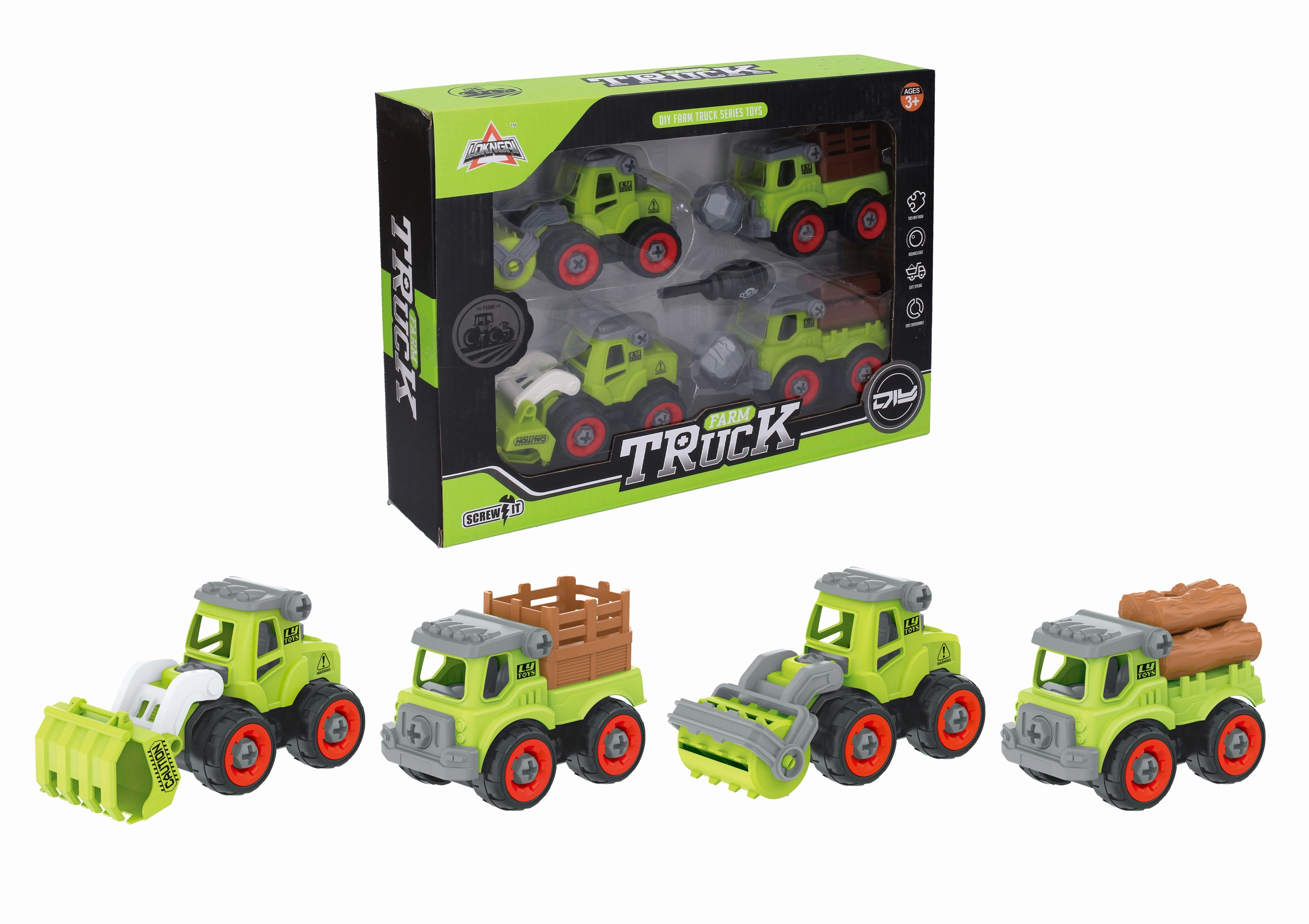 Kruvikeerajaga põllumajandusautod suurusega 13 cm pakuvad väikestele mehaanikutele vahvat ajaviidet. Komplektis on vabalt veerevad rattad ja kruvikeeraja, millega lapsed saavad tundide kaupa mängida ja oma oskusi arendada.