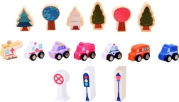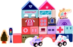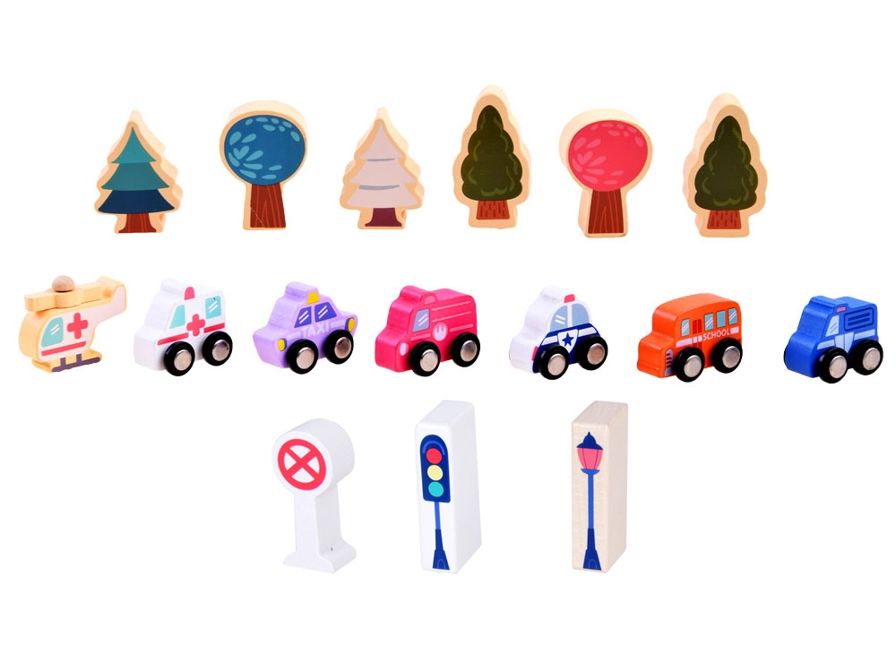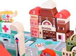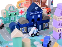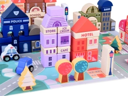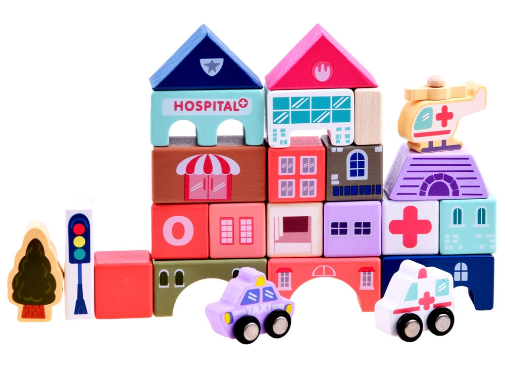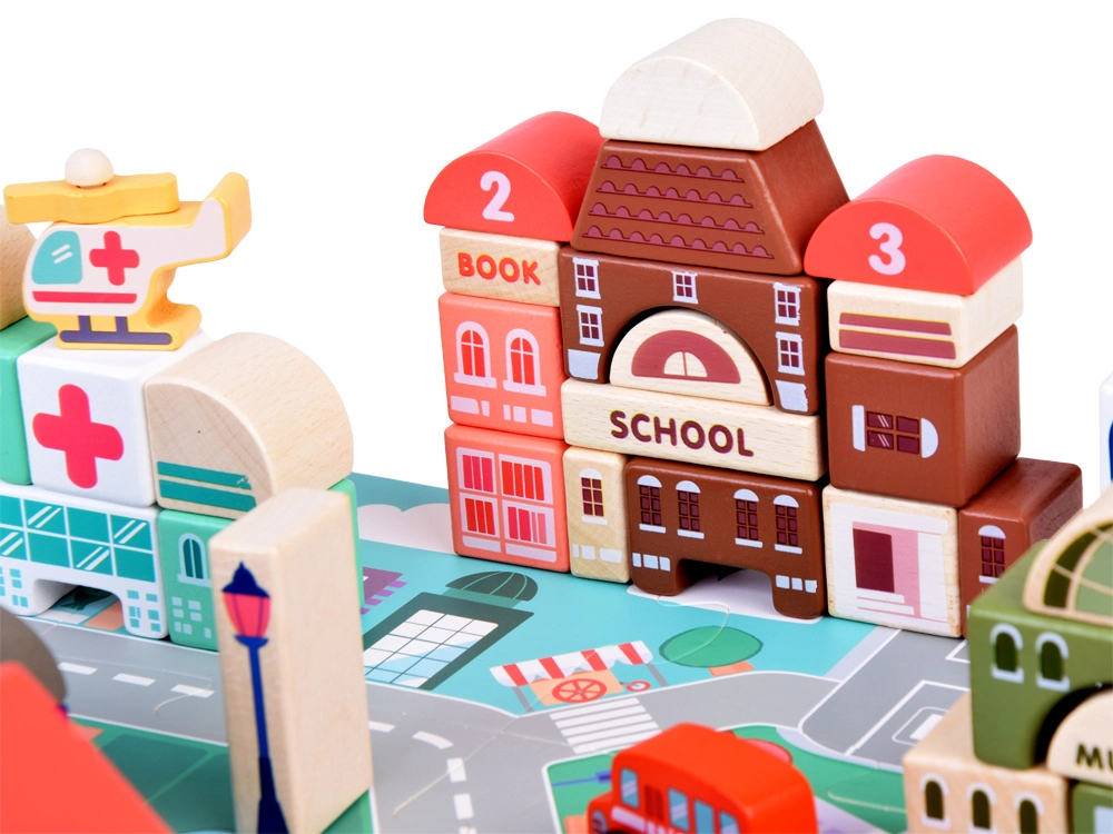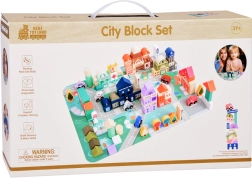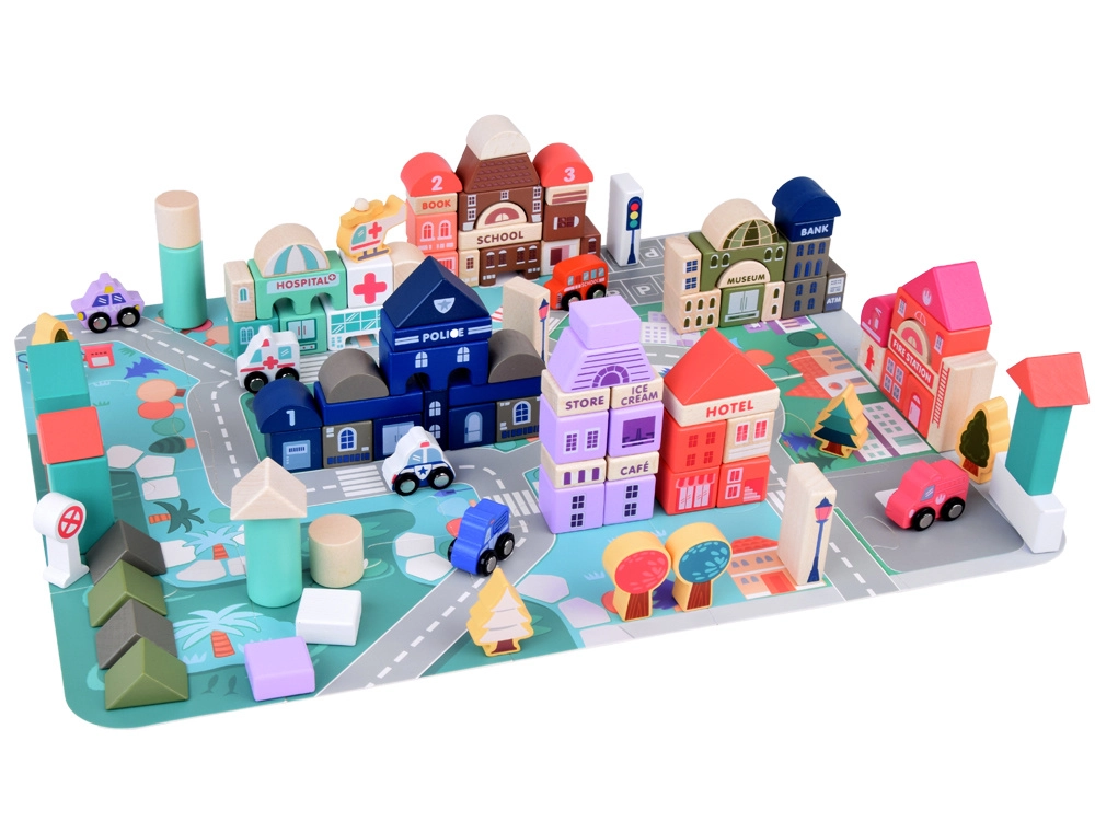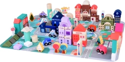 See pastelltoonides komplekt sisaldab 115 mitmekesist puidust detaili, sh hooned, sõidukid, puud ja liiklusmärgid. Lapsed saavad ehitada oma linna koos kooli, haigla, panga ja politseijaamaga. Selle ehituskomplektiga arenevad nii fantaasia kui ka motoorsed oskused.
